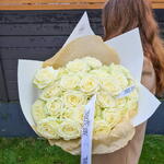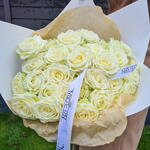 Weiße Rosen sind das Sinnbild von Unschuld, Reinheit und Vollkommenheit. Ihre zarten Blütenblätter strahlen eine zeitlose Eleganz aus, die jeden Raum erhellt. Ein Strauß aus weißen Rosen ist das ideale Geschenk für Anlässe wie Hochzeiten, Verlobungen und Taufen, aber auch, um Trost und Mitgefühl auszudrücken. Er steht für die reinen Gefühle des Herzens und vermittelt eine Botschaft der Hoffnung und Freude. Dieser Blumenstrauß ist eine Erinnerung daran, dass Schönheit in ihrer reinsten Form oft die kraftvollste ist. Er fängt die Einfachheit und die zeitlose Anmut der weißen Rosen ein und lässt sie in voller Pracht erstrahlen. Wir achten ständig auf die letzten Trends im Bereich des Floristikdesigns und unsere Bouquets sind die Reflexion davon. Bei der Zusammenstellung verwenden wir nur ganz frische Blumen und die modernsten Materialien. Unser Team steckt besondere Liebe zum Detail in jedes Arrangement, deshalb finden Sie immer einen Sticker mit unserem Logo und ein Firmen Bändchen als Qualitätssiegel an jedem Strauß. Dem Blumenstrauß legen wir eine Anleitung zur Pflege und ein Mittel zur Verlängerung der Lebensdauer der Blumen bei. Jetzt ganz bequem bestellen und Ihre Blumen an Ihre Wunschadresse liefern lassen.