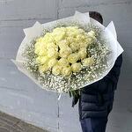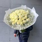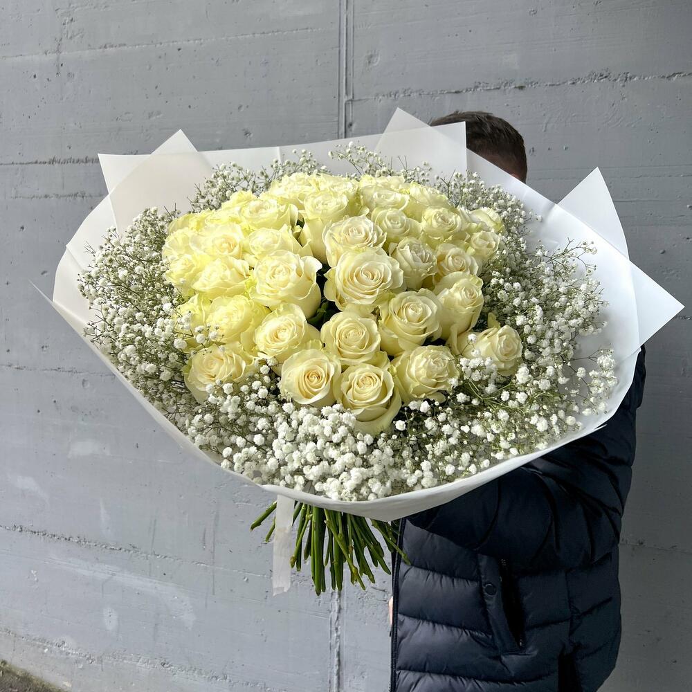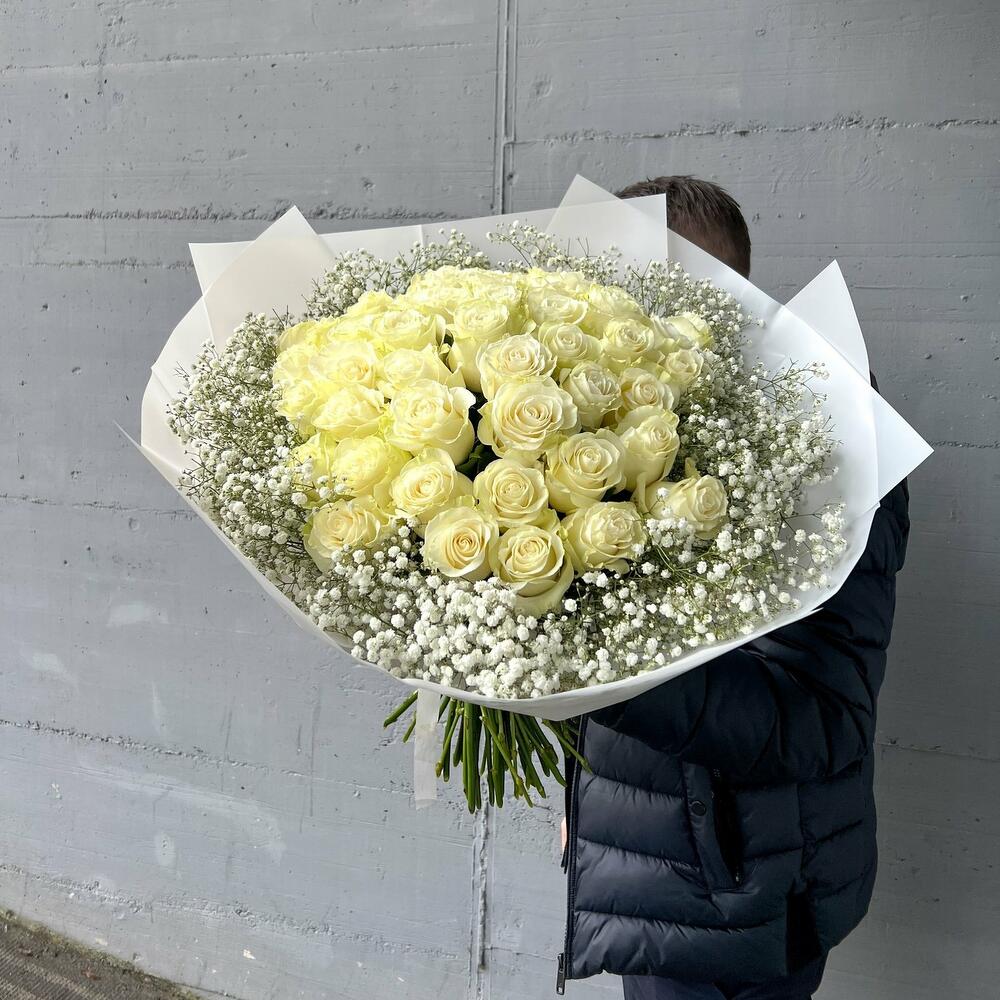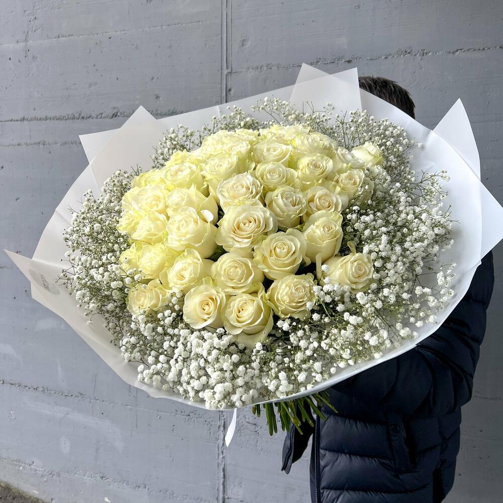 Blumenstrauß Weiße Rosen und Schleierkraut Ein Bouquet, das puren Luxus und zeitlose Schönheit verkörpert: 50 edle weiße Rosen, sanft umrahmt von zarter, weißer Gypsophila, erschaffen ein harmonisches Meisterwerk voller Eleganz und Anmut. Weiße Rosen symbolisieren Reinheit, Treue und aufrichtige Liebe – Gefühle, die oft schwer in Worte zu fassen sind, aber in diesem prachtvollen Strauß perfekt zum Ausdruck kommen. Die feinen, schneeweißen Blüten des Schleierkrauts verleihen dem Bouquet eine federleichte, romantische Note und lassen die majestätischen Rosen noch mehr erstrahlen. In einer stilvollen weißen Verpackung präsentiert, wird dieser Strauß zu einem unvergesslichen Geschenk, das Herzen berührt und Erinnerungen für immer schafft. Ob als Zeichen tiefer Liebe, zum Jubiläum, zur Hochzeit oder als elegante Geste zwischendurch – dieser Strauß verleiht jedem Moment einen Hauch von Magie. Jede einzelne Rose wird sorgfältig ausgewählt und liebevoll von Hand arrangiert, um ein perfektes Gesamtbild zu schaffen. Das Ergebnis ist ein edles Kunstwerk der Floristik, das Emotionen weckt und lange in Erinnerung bleibt. Wir achten ständig auf die letzten Trends im Bereich des Floristikdesigns und unsere Bouquets sind die Reflexion davon. Bei der Zusammenstellung verwenden wir nur ganz frische Blumen und die modernsten Materialien. Unser Team steckt besondere Liebe zum Detail in jedes Arrangement, deshalb finden Sie immer einen Sticker mit unserem Logo und ein Firmen Bändchen als Qualitätssiegel an jedem Strauß. Dem Bouquet legen wir eine Anleitung zur Pflege und ein Mittel zur Verlängerung der Lebensdauer der Blumen bei. Jetzt ganz bequem bestellen und Ihre Blumen an Ihre Wunschadresse liefern lassen. ширина, см: 51 высота, см: 70 длина, см: 52
