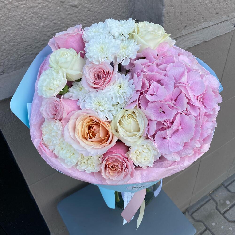 rosa - 8 pz ortensia - 1 pz garofano - 6 pz margherita - 2 pz
