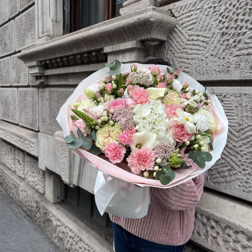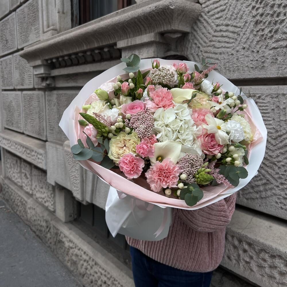 Eucalyptus - 7 pz rose - 5 pz calla - 3 pz ortensia - 1 pz