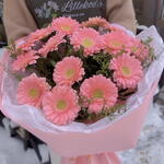 A delicate bouquet featuring soft pink gerberas complemented by elegant decorative greenery. Light, fresh, and beautifully balanced — a perfect choice for expressing warmth and gentle emotions. Free message card included. Kindly leave your message in the comments.