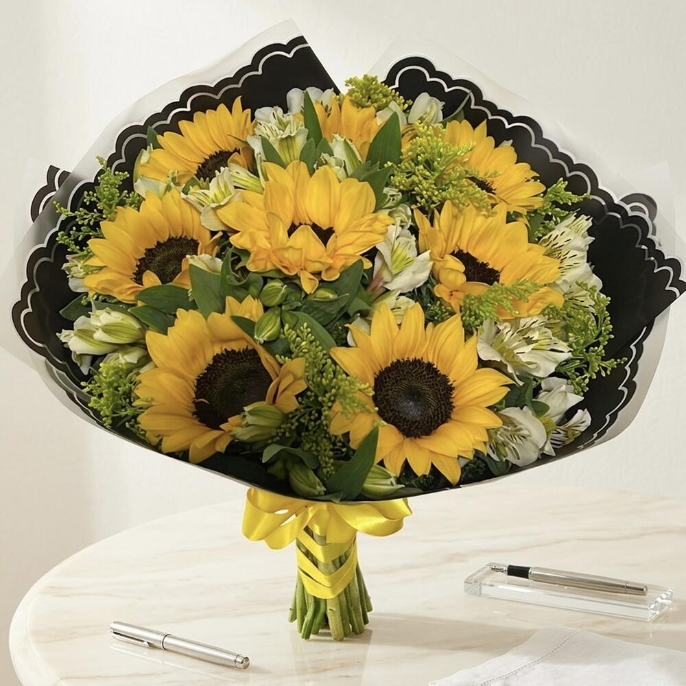 Solidago - 6 pz astromelias - 8 pz papel - 2 pz girasoles mini - 8 pz moño - 1 pz