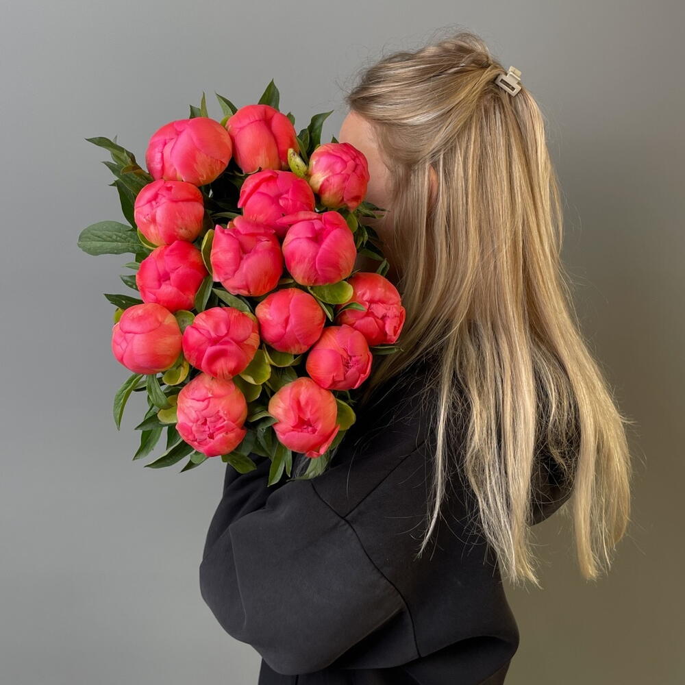 БУКЕТ ИЗ 15 КОРАЛЛОВЫХ ПИОНОВ ПОД ЛЕНТУ