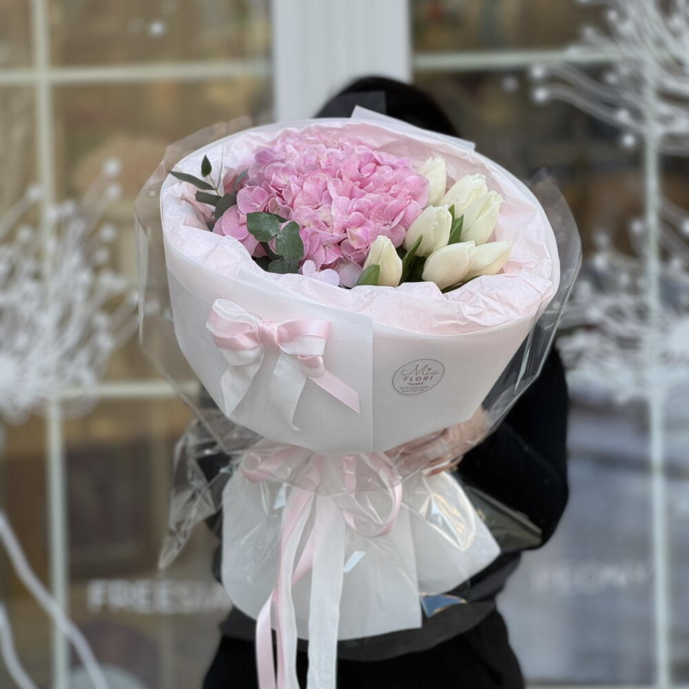 Букет из гортензии и белых тюльпанов - "Розовая изысканность"