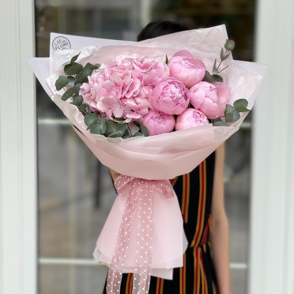 Букет из пионов с гортензией - «Французский поцелуй»