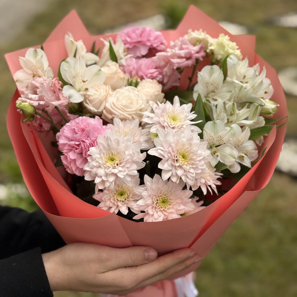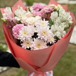 Crisantemo - 1 pz Alstroemeria - 3 pz garofano - 3 pz rosa a rametto - 1 pz carta decorativa - 4 pz pistacchio - 3 pz