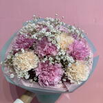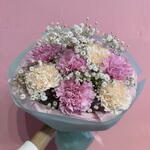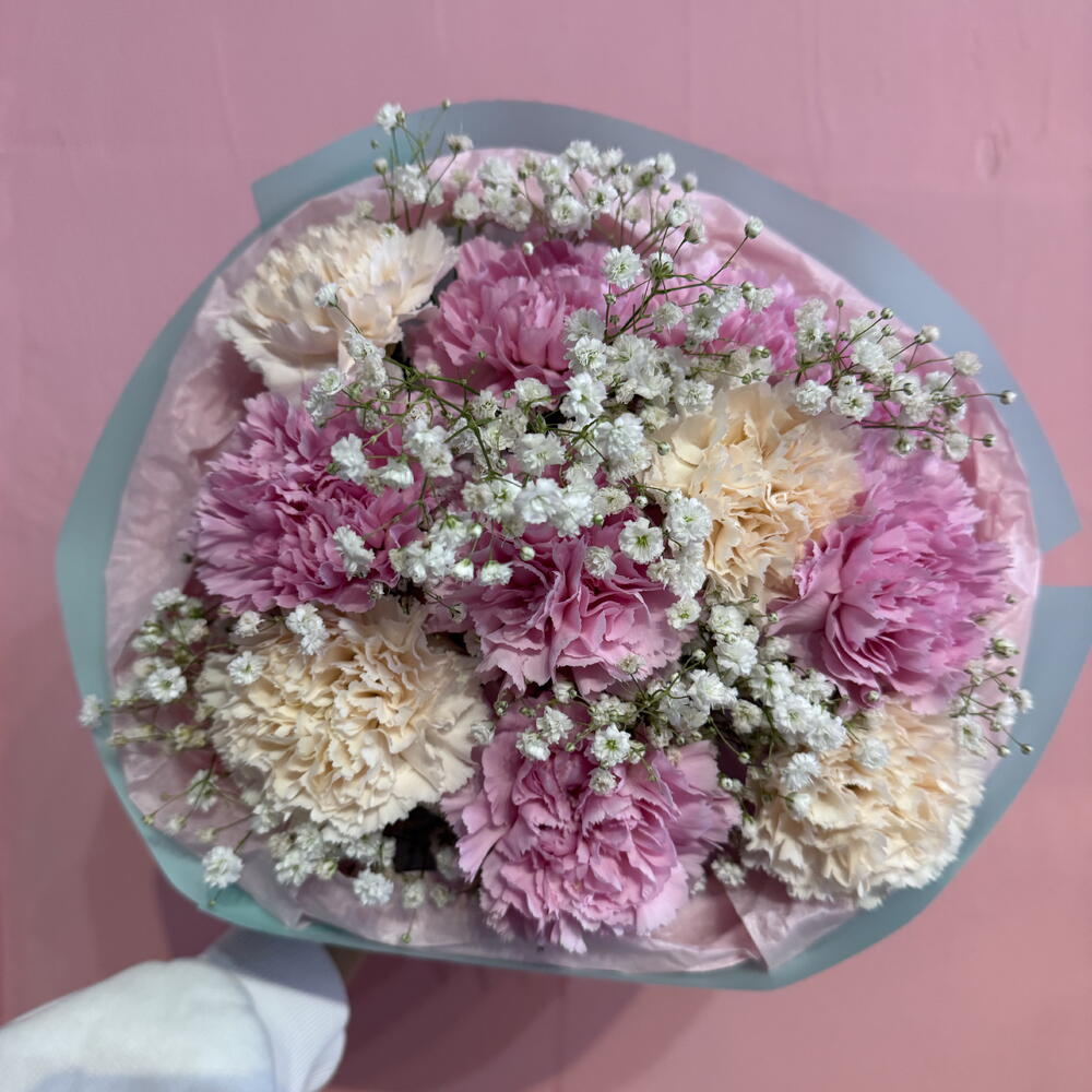 Un bouquet delicato e romantico di garofani crema e rosa, delicatamente decorato con una leggera gipsofila. La combinazione di tonalità pastello conferisce alla composizione un'eleganza e una freschezza eccezionali, e le morbide linee floreali creano una sensazione di leggerezza e armonia. È il bouquet ideale per chi apprezza la bellezza classica in una versione delicata — perfetto per ogni occasione: compleanni, ringraziamenti o per esprimere sentimenti affettuosi.