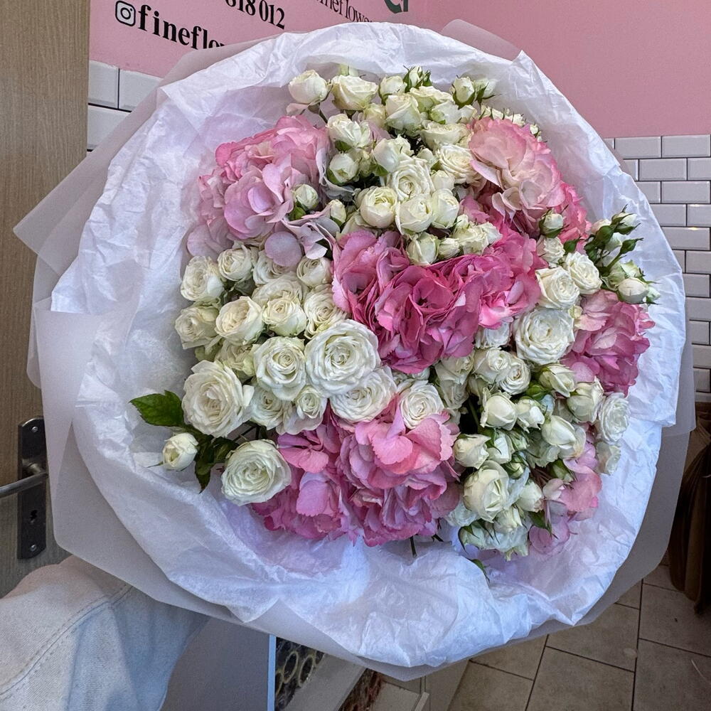 Un bouquet delicato e al tempo stesso deciso, composto da ortensie e rose a rami, è una composizione piena di eleganza, romanticismo e fascino naturale. Le corolle soffici e imponenti delle ortensie conferiscono al bouquet morbidezza e volume, creando l'effetto di una sottile nuvola di fiori. Il loro carattere nobile è perfettamente completato dalle piccole e graziose rose a rami, che apportano alla composizione leggerezza, freschezza e dettagli raffinati. Questa combinazione simboleggia l'armonia dei sentimenti, la gratitudine e il calore delle relazioni, perciò il bouquet è perfetto come regalo per occasioni speciali – dai compleanni, alle ricorrenze, fino a un gesto elegante senza un motivo particolare. La composizione incanta con la sua sottile cromia, la forma naturale e l'eleganza senza tempo – ideale per chi apprezza la bellezza racchiusa in dettagli delicati e curati.