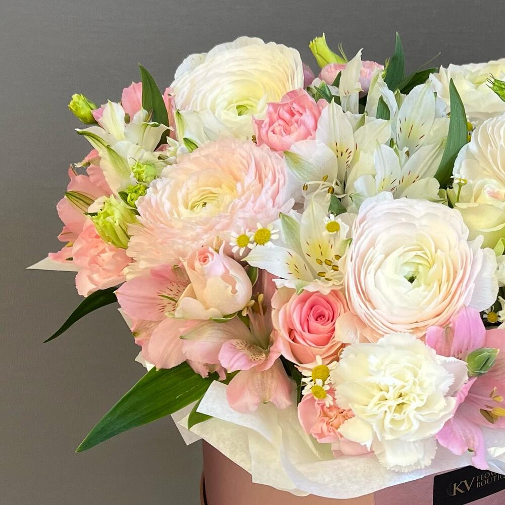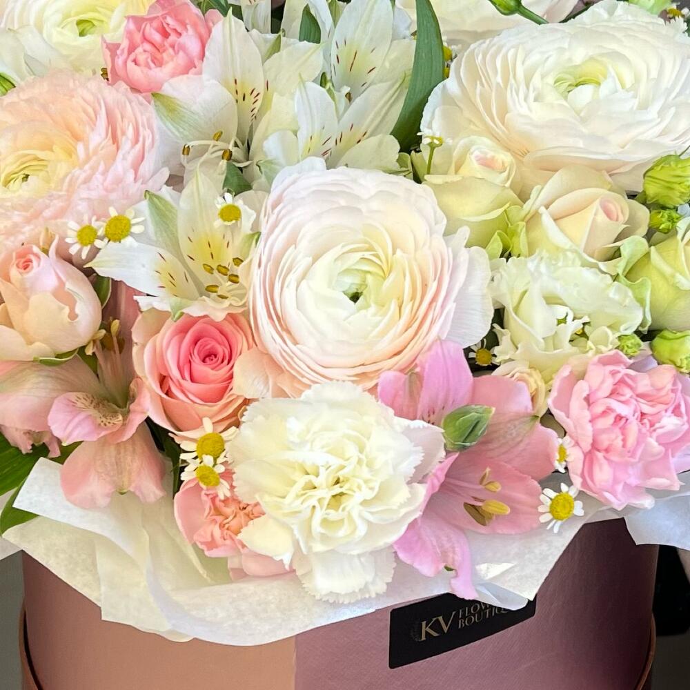 white alstroemeria - 2 pz ranuncolo - 5 pz pink alstroemeria - 2 pz lisianthus bianco - 1 pz rosa da cespuglio - 3 pz matricaria - 3 pz scatola a forma di cuore - 1 pz white bush dianthus - 3 pz pink bush dianthus - 3 pz
