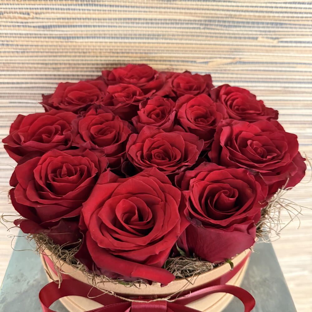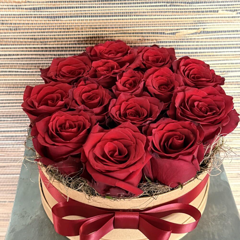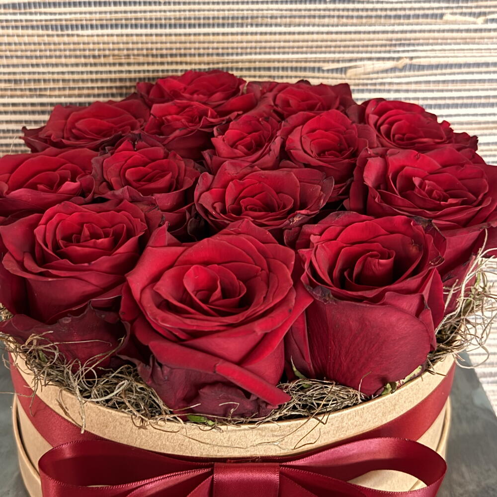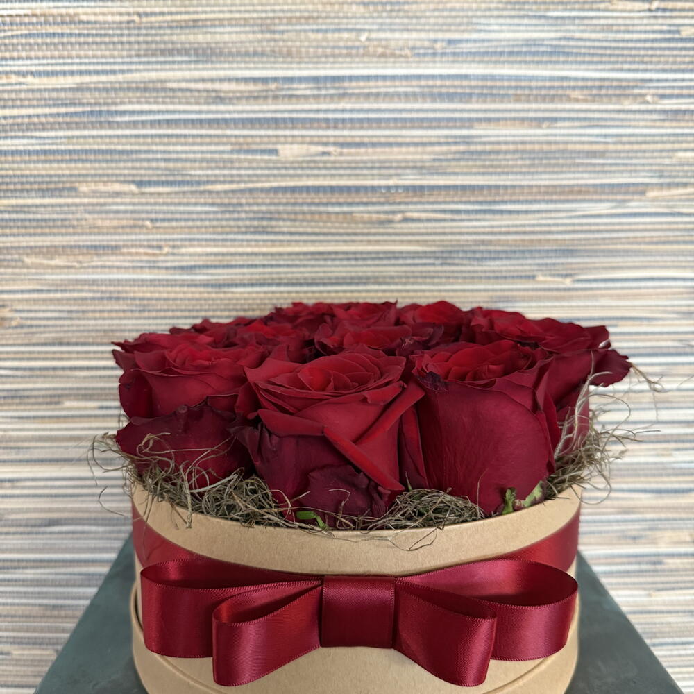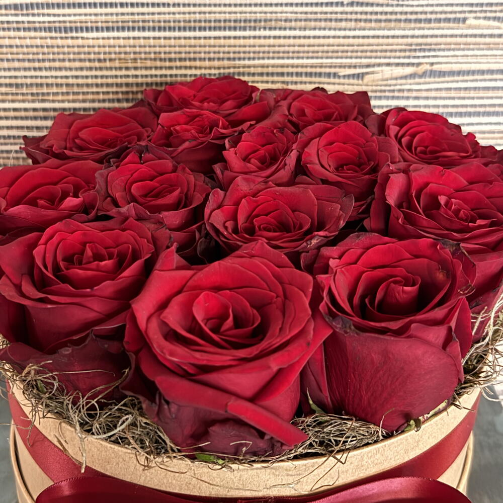 Velvety roses touch tenderly in hat box. A gift that touches you.