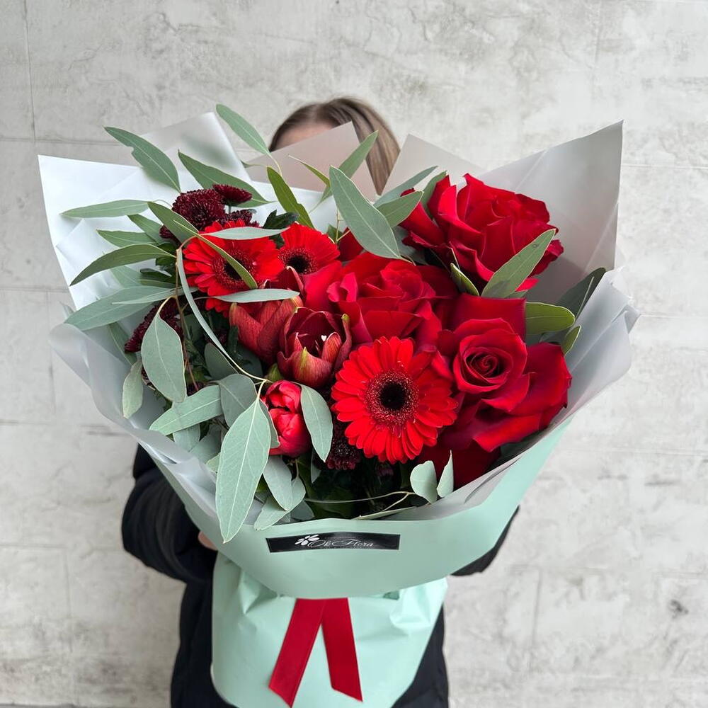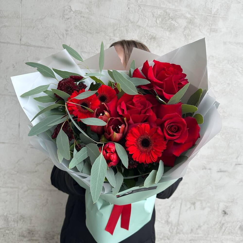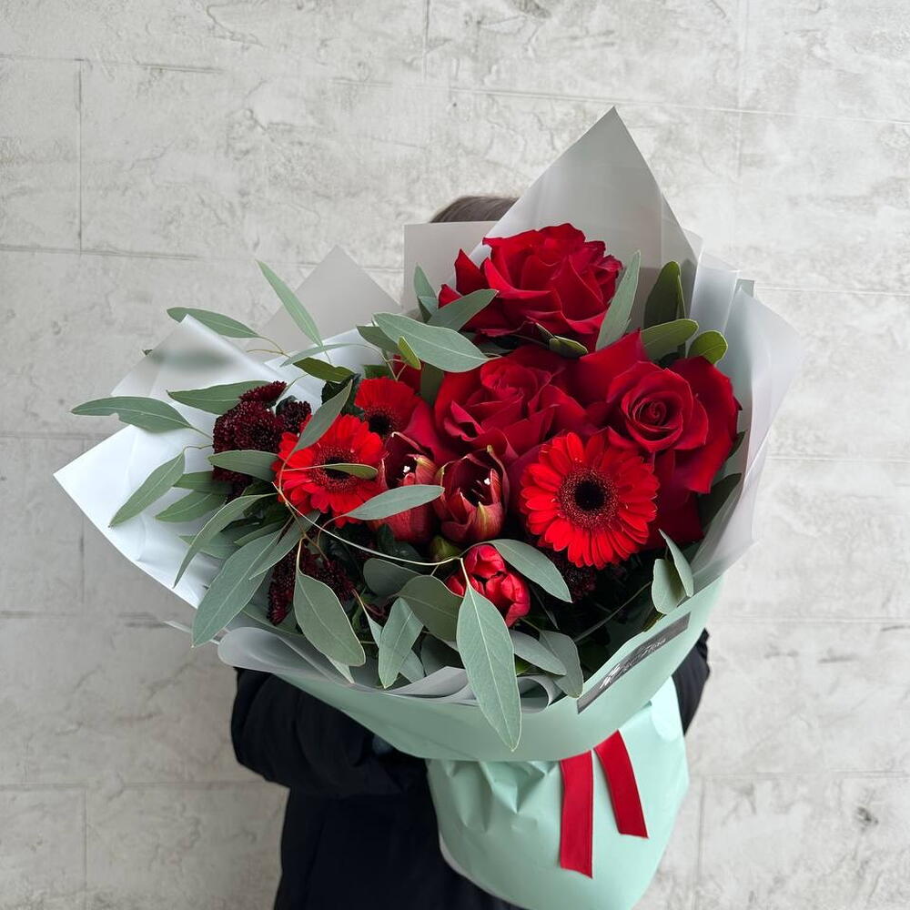 Амариллис - 1 pz Cespuglio di crisantemo - 3 pz Gerbera - 3 pz Эвкалипт Микс - 3 pz декоративная зелень - 3 pz rose - 3 pz
