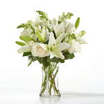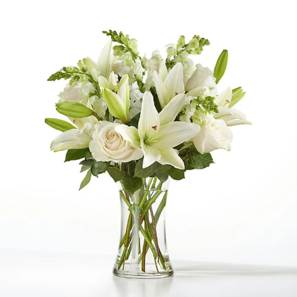 An exuberance of bright and beautiful white blossoms provides an exquisite way to deliver your expressions of sympathy and comfort. This life affirming tribute combines white roses, snapdragons and Asiatic lilies accented by lush greens arranged in a clear glass 8 vase. An excellent choice for a wake, funeral service or for sending your condolences to the home of grieving family or friends. Details The Deluxe Bouquet is approximately 18H x 15W. Designed by florists, ready to display. For long–lasting blooms, replace the water daily. We suggest trimming the stems every couple days. Pet Safety Precautions: This bouquet or plant may include flowers and foliage that are known to be toxic to pets. To keep them safe, be sure to keep this arrangement out of your pets reach.