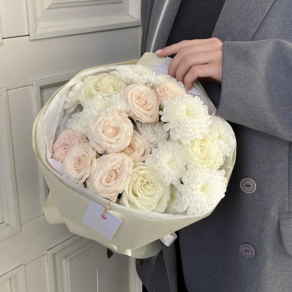 Роза белая одноголовая - 3 pz хризантема алтай - 2 pz кустовая роза софи - 3 pz