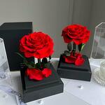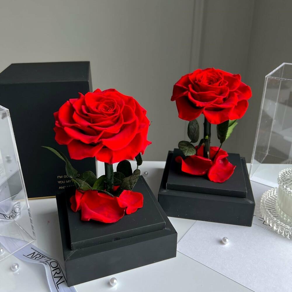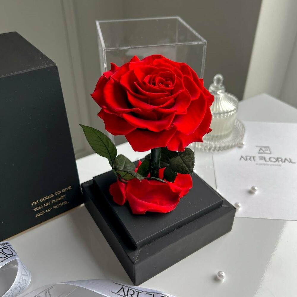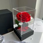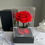 Ewige rote Rose im schwarzen Acryltower