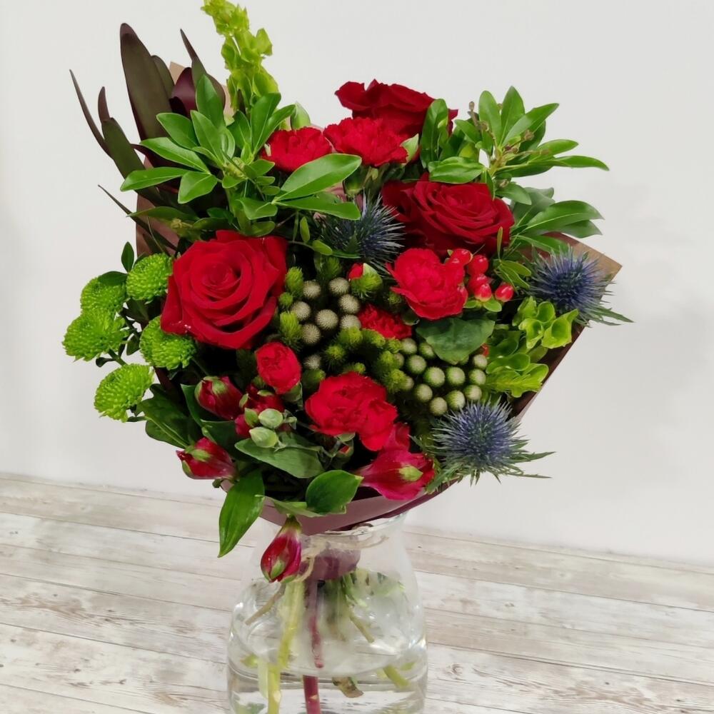 A beautiful hand-tied bouquet of red roses, blue eryngium flowers and greenery selected by our florists. All flower are unique, that’s why the photo is of an informational nature. The color, size and form of the flower that you see in the photo may vary.