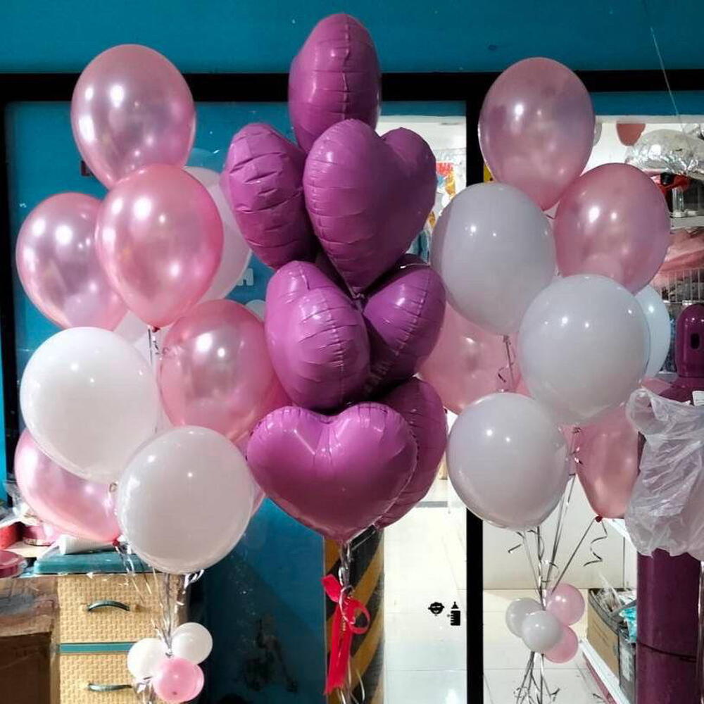 Scatola - 1 pz Rosa rosa - 10 pz Gigli bianchi - 5 pz postcard - 1 pz garofano rosa - 10 pz ortensia bianca - 2 pz ortensia rosa - 4 pz white matthiola - 10 pz bush roses pink - 15 pz pink helium balloons - 20 pz pink heart shader balloons - 10 pz