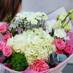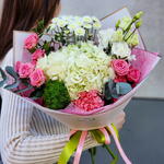 Eustoma - 1 pz Ortensia - 1 pz Pistacia - 1 pz chrysanthemum bush - 1 pz cespuglio di rose - 2 pz garofano - 1 pz eucalipto - 2 pz dianthus moss - 1 pz