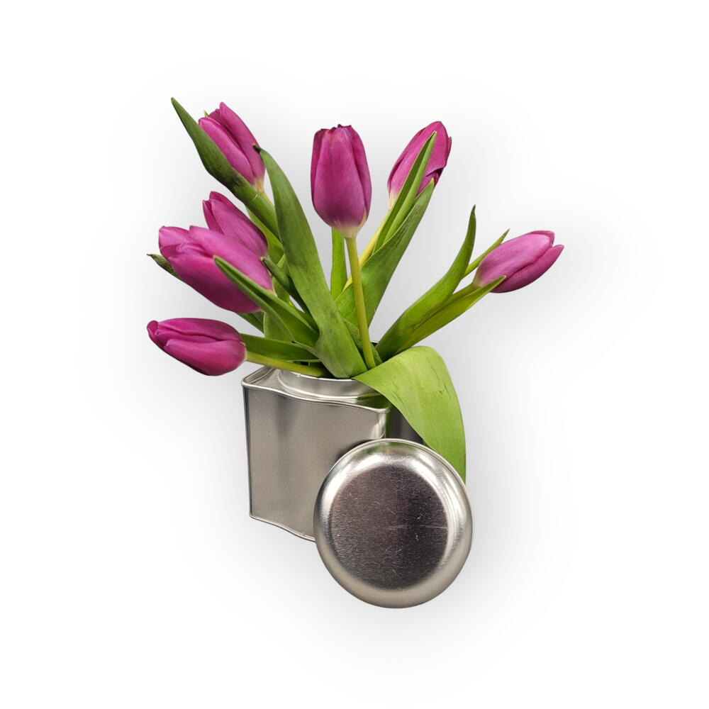 Industrial and modern. Tulips in a tin