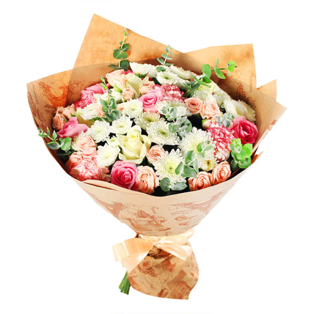 garofano - 7 pz eucalipto - 5 pz rosa bianca - 5 pz rosa rosa - 5 pz confezione decorativa - 1 pz crisantemo arbustivo - 5 pz rosa arbustiva - 7 pz