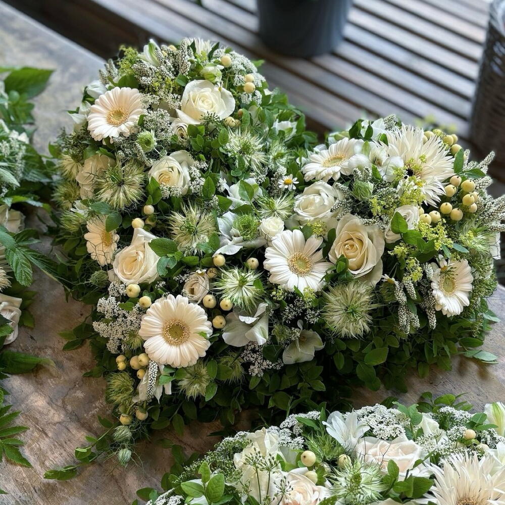 Cuore funerario con fogliame e mix di fiori. Non contiene nigella!!