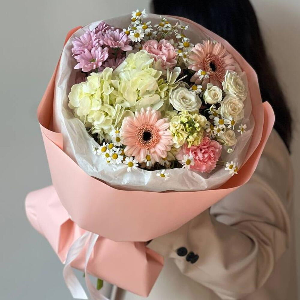Tanacetum - 3 pz Rosa cespuglio - 1 pz Crisantemo - 1 pz Gerbera - 2 pz гортензии - 1 pz диантусы - 2 pz