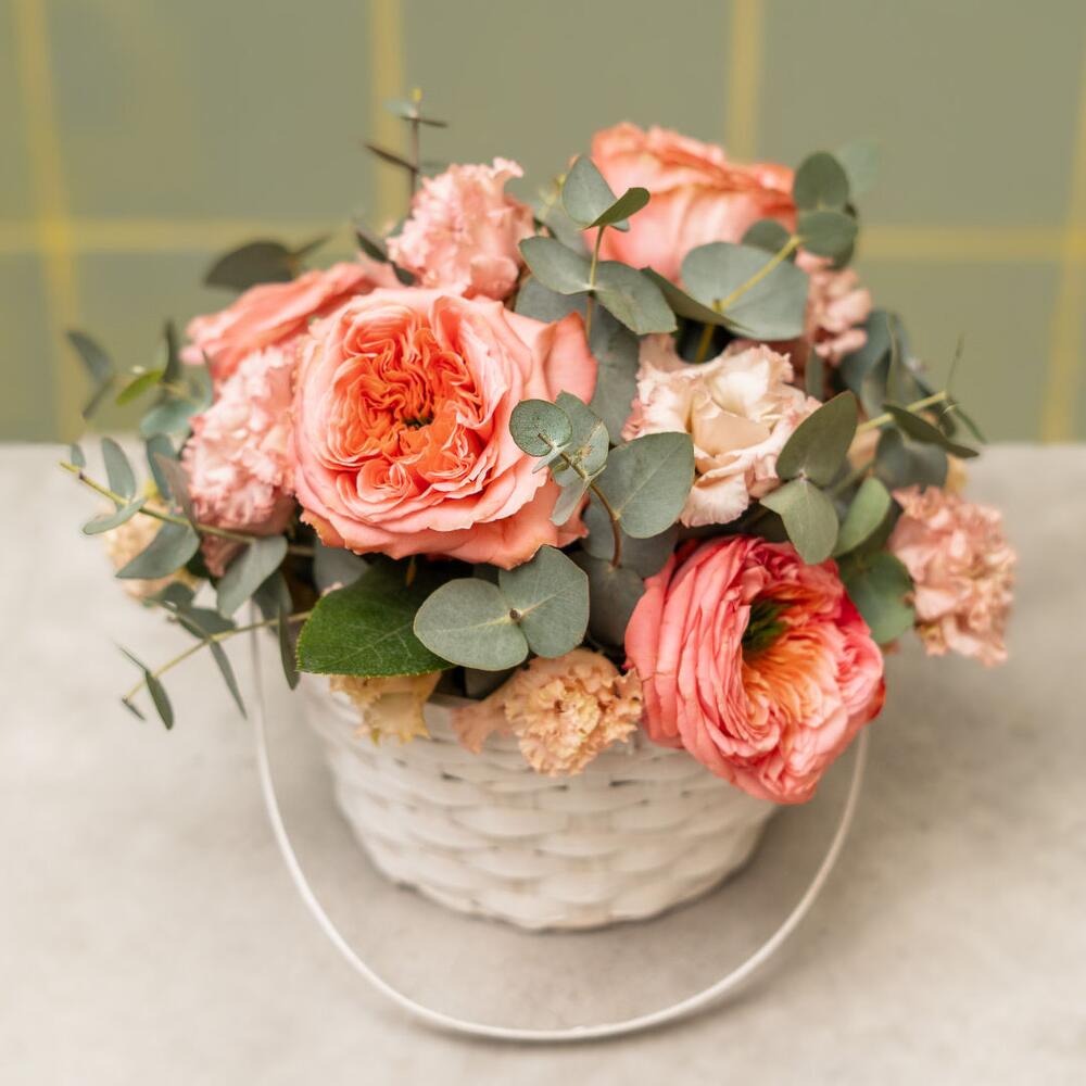 Eucalipto - 5 pz zahradní růže mandarin x-pression - 3 pz eustoma ruzova - 3 pz