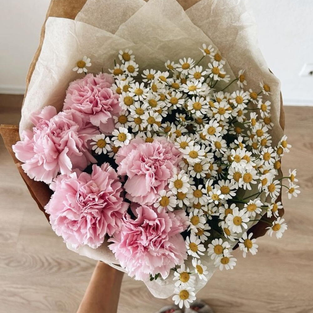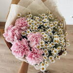 Милый авторский дуо букет ромашки с диантусами