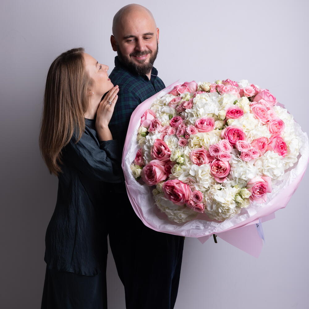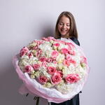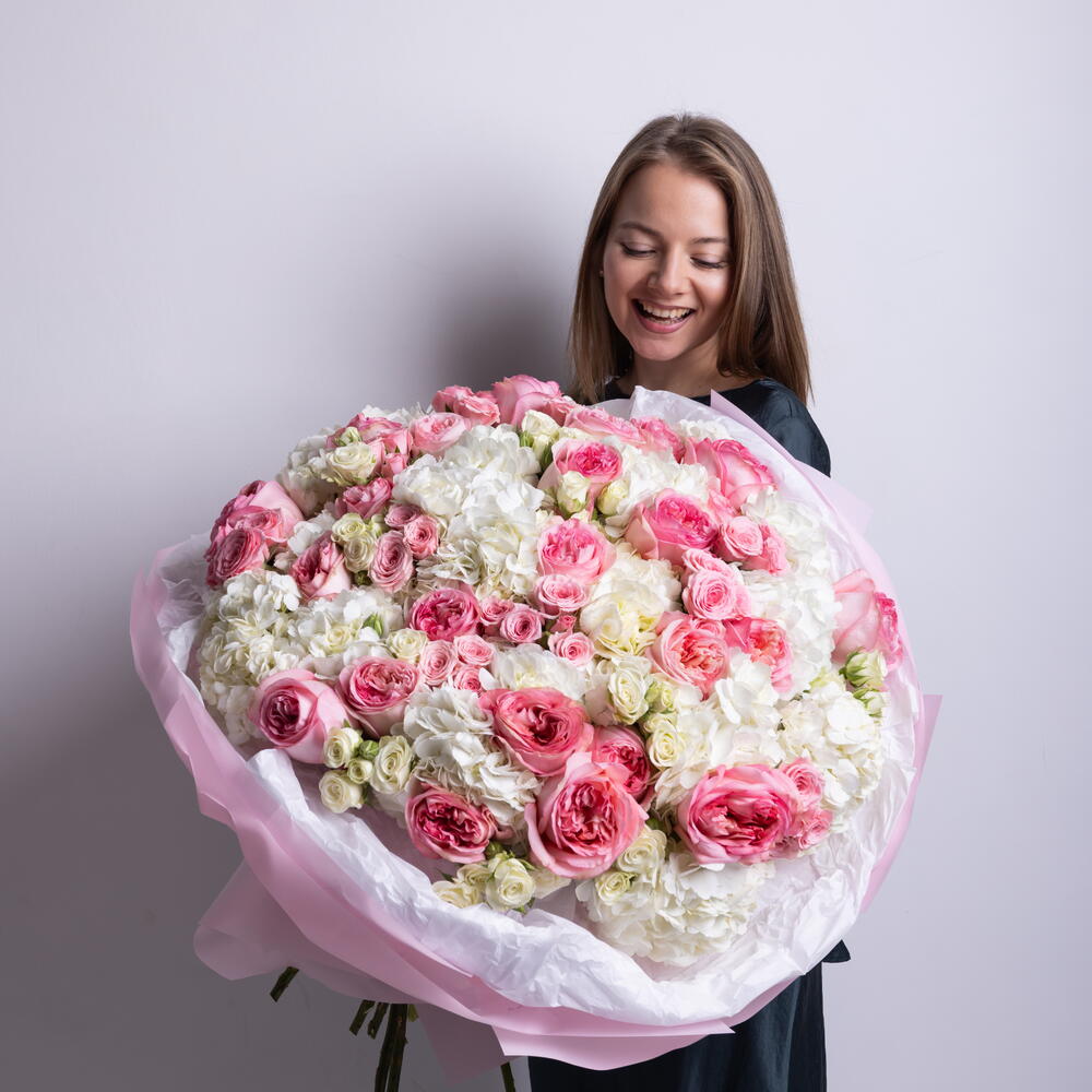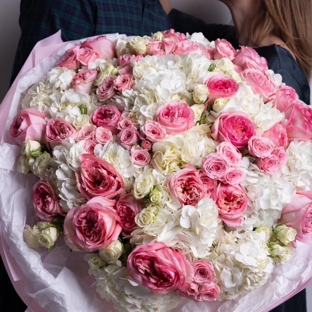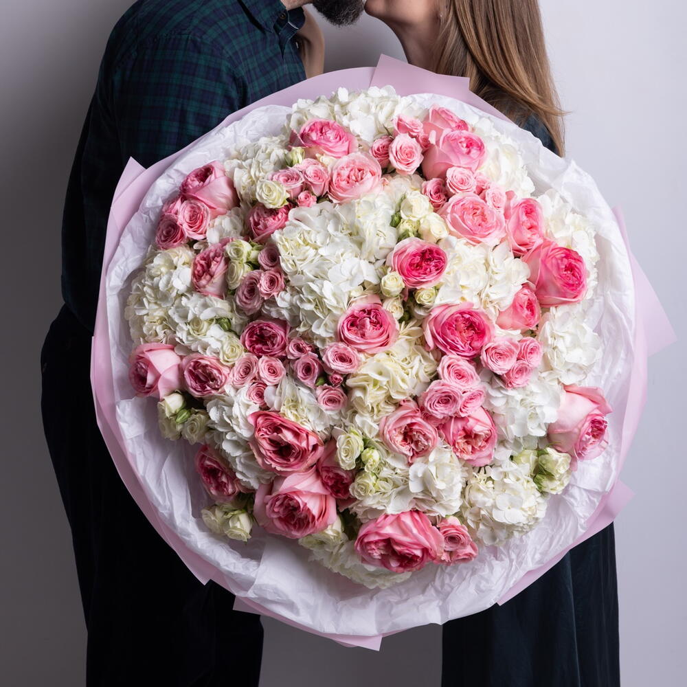 Misto di rose Pink Expression, ortensie bianche, rose a spray in rosa e bianco