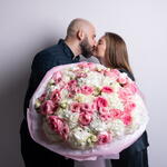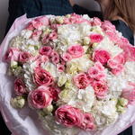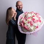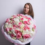Букет красивый получился. Доставили немного позже назначенного времени, не критично для нас это было. Фото отчет сделали быстро. Доставка считаю дорогая, плюс большие розы не первой свежести были.