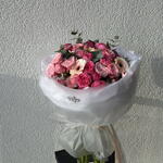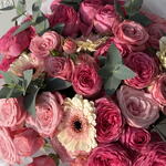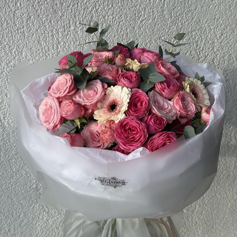 Gerbera - 7 pz eucalipto - 5 pz rosa rosa espressione - 5 pz rosa spray rosa - 5 pz