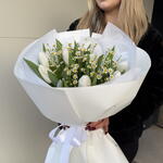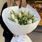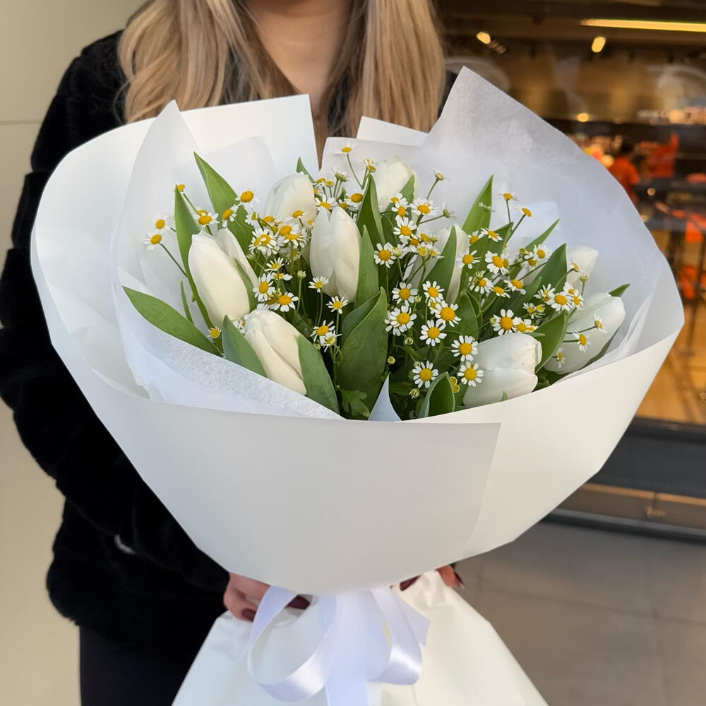 Этот авторский букет пронизан мягкостью и элегантностью, которые берут своё начало от изысканных ромашек танацетум. Всего четыре цветка, словно четыре стихии, они сплетаются в прекрасном танце с девятью столь же очаровательными тюльпанами, завезенными прямо из Голландии. Белые цветы, словно символизирующие чистоту и нежность, переливаются на свету, представляя собой мастерское сочетание натуральной красоты и таланта цветовода. Этот букет - идеальный подарок для любого случая.