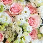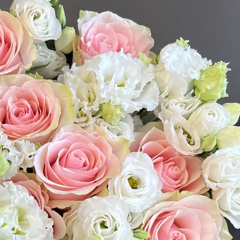 Nastro di raso - 1 pz Eustoma - 8 pz rose ecuador - 19 pz eustoma bianco - 8 pz