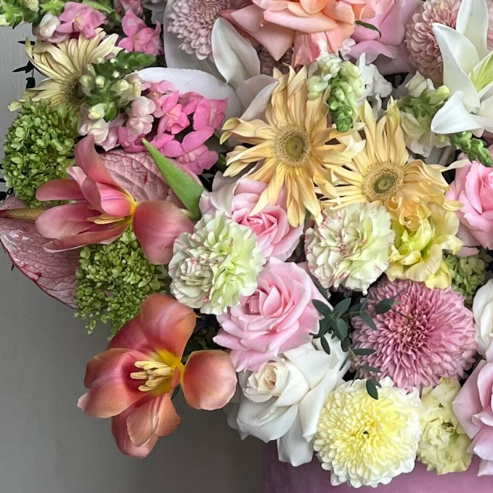 Tulips - 5 pz Gerbera - 5 pz giglio bianco - 3 pz anturio - 3 pz bocca di leone - 9 pz lisiantus - 5 pz delphinium - 5 pz garofano - 7 pz eucalyptus leaves - 5 pz ortensia - 10 pz rose bianche - 15 pz mix di rose da giardino - 10 pz rose rosa - 20 pz gompi - 15 pz peony mom - 3 pz