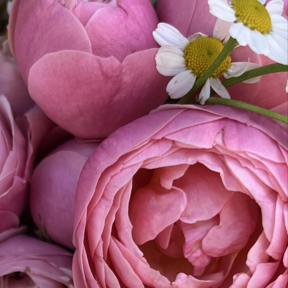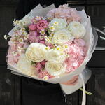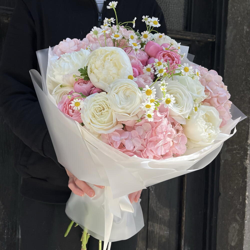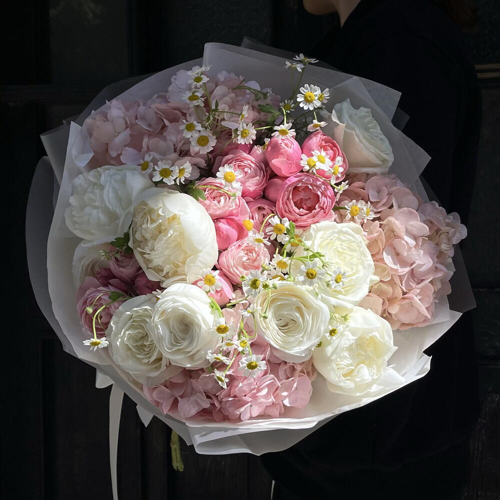 ortensia - 3 pz ranuncolo - 3 pz tanaceto - 3 pz confezione di design - 1 pz peonia rosa spray - 3 pz rose ecuadoriane - 3 pz paeonia - 4 pz
