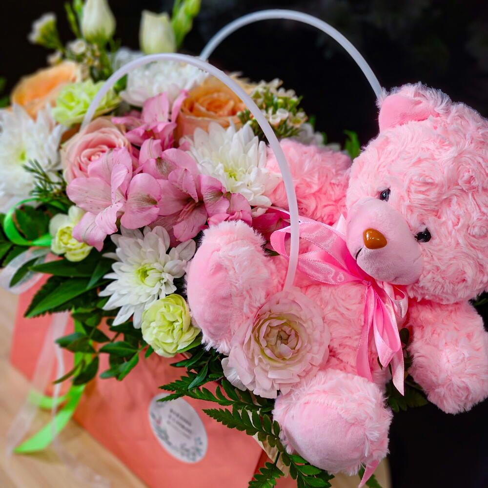 Eucalipto - 6 pz Scatola - 1 pz Alstroemeria - 1 pz Pistacia - 5 pz orsetto di peluche - 1 pz Fiore di cera - 3 pz rose - 3 pz garofano - 1 pz garofano spray - 1 pz rumora - 1 pz