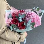 Eucalipto - 3 pz ortensia - 1 pz garofano - 2 pz protea - 1 pz roses - 3 pz