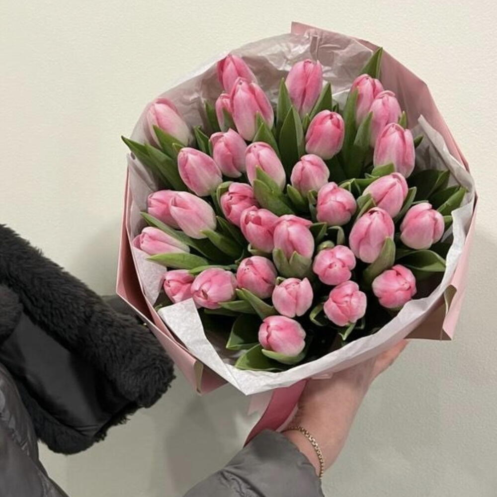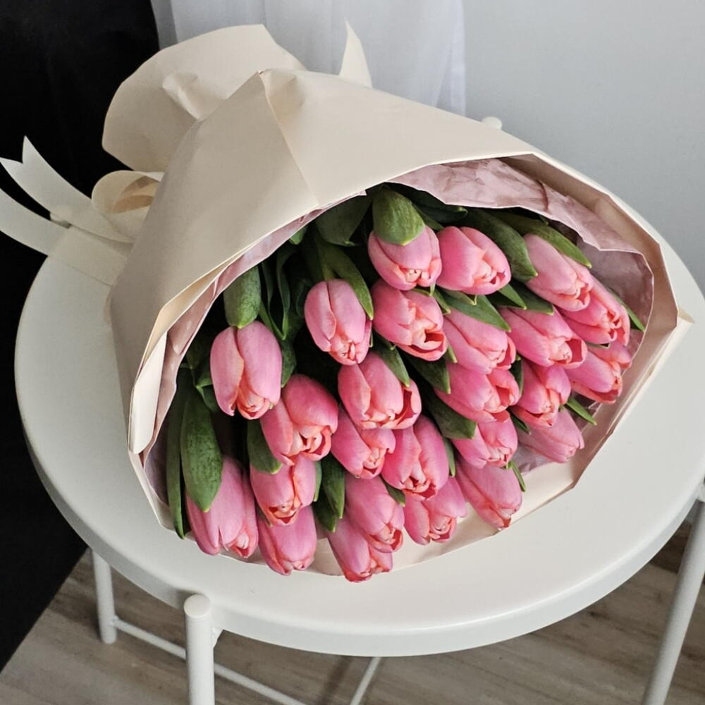 Packaging of the bouquet, tulip variety, shade of pink color may vary from the photo.