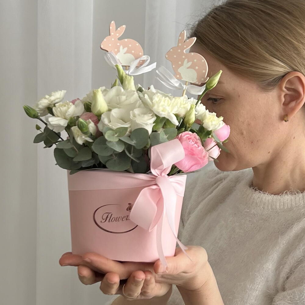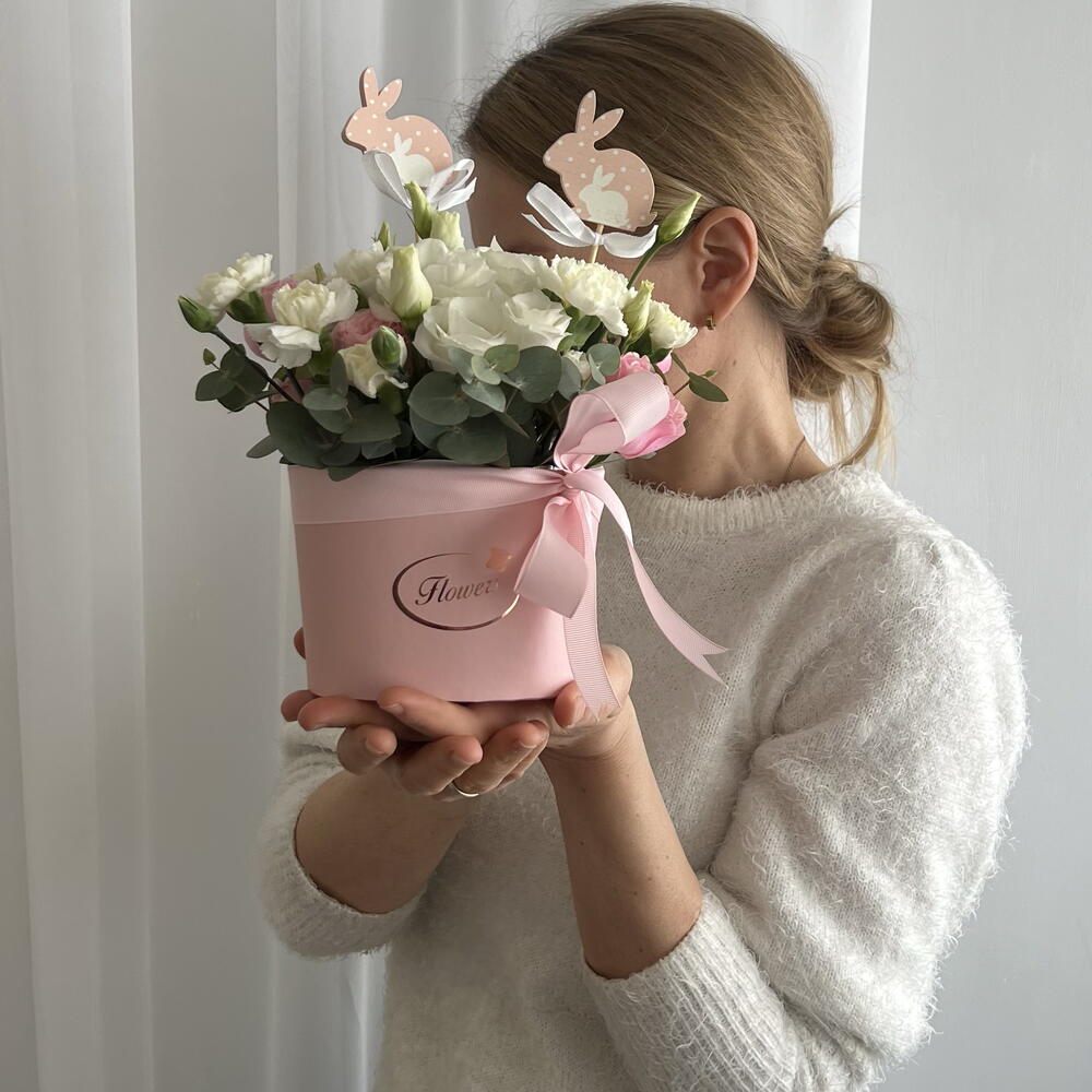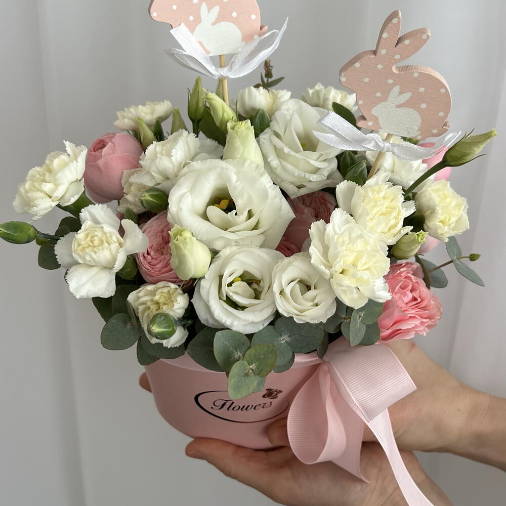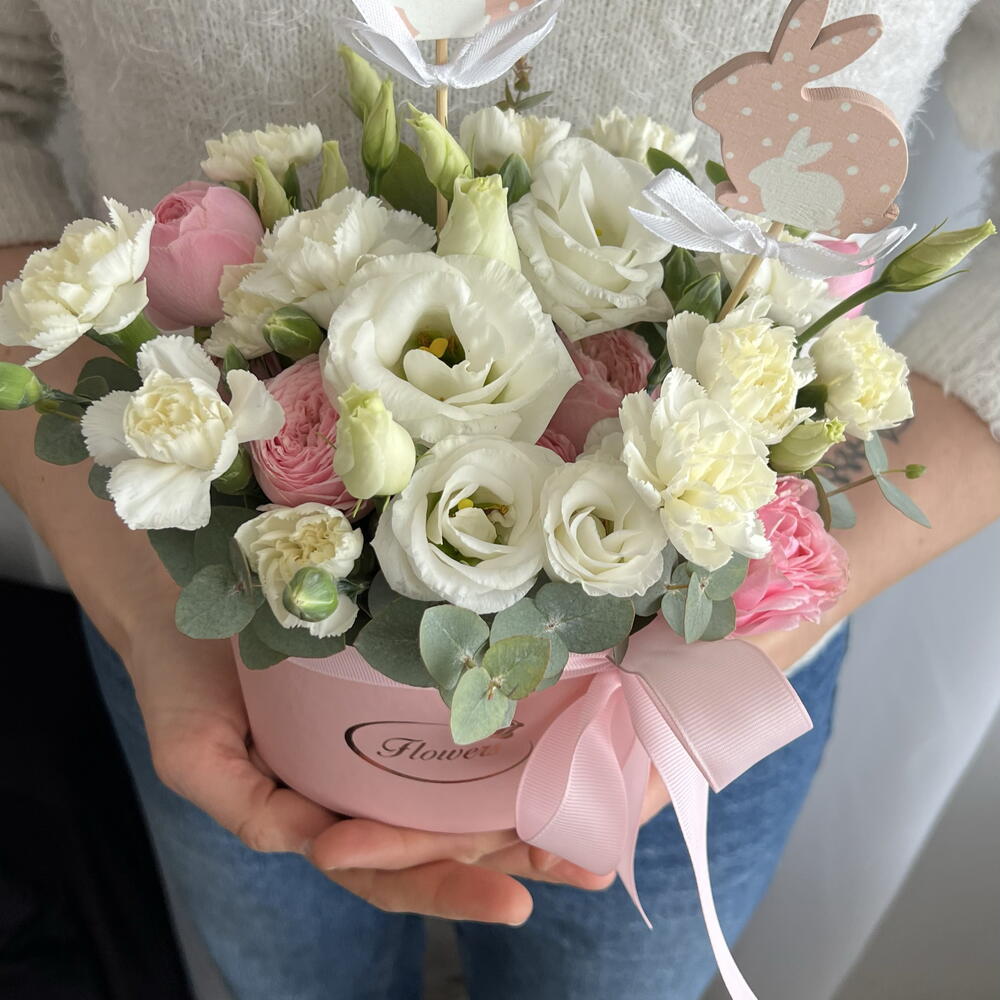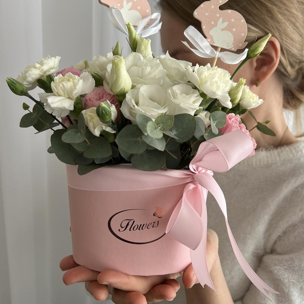 Eustoma bianco - 3 pz dianthus white - 3 pz eucalipto - 3 pz biglietto di auguri - 1 pz scatola per cappelli - 1 pz roses - 7 pz