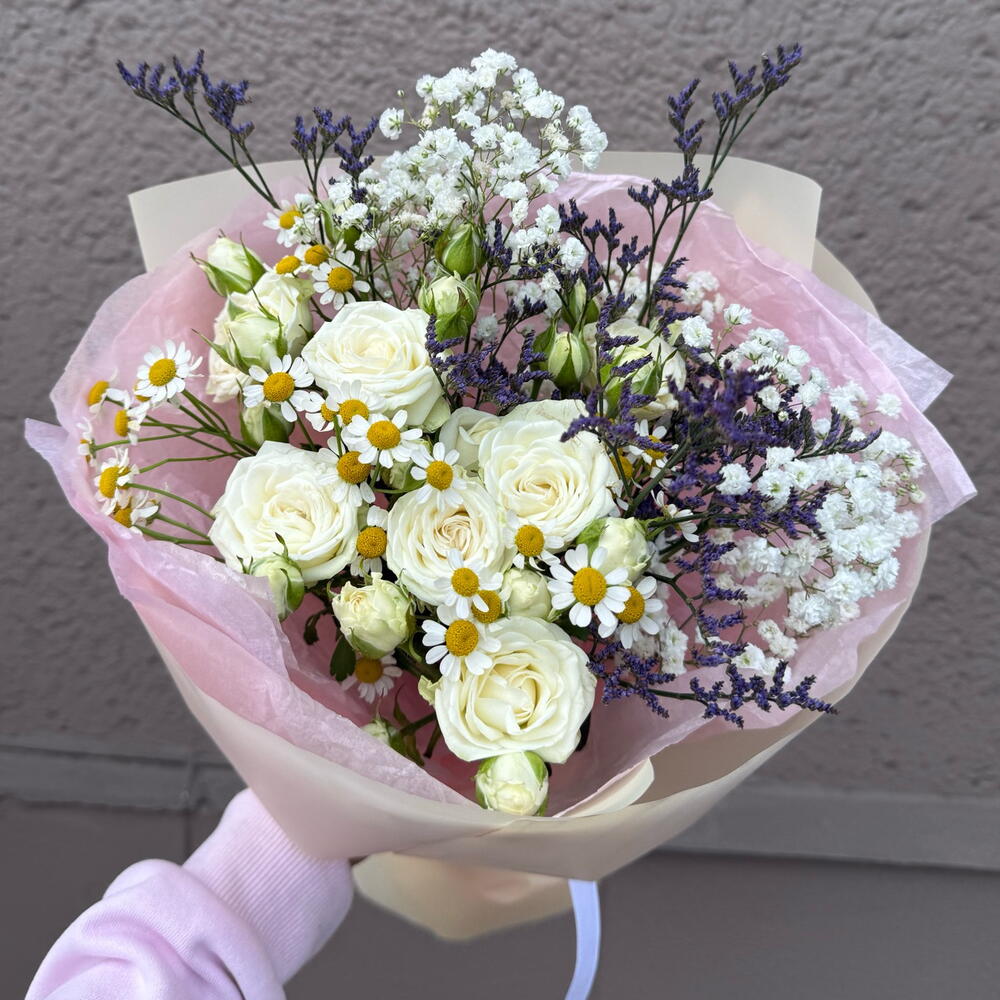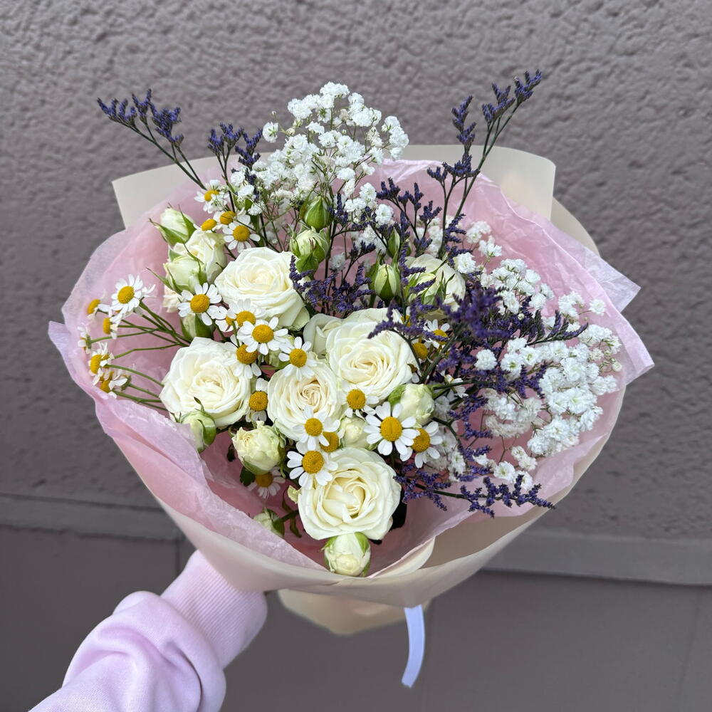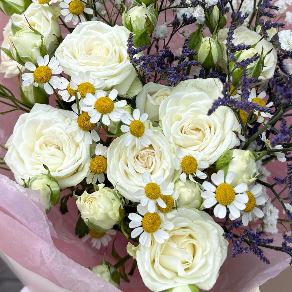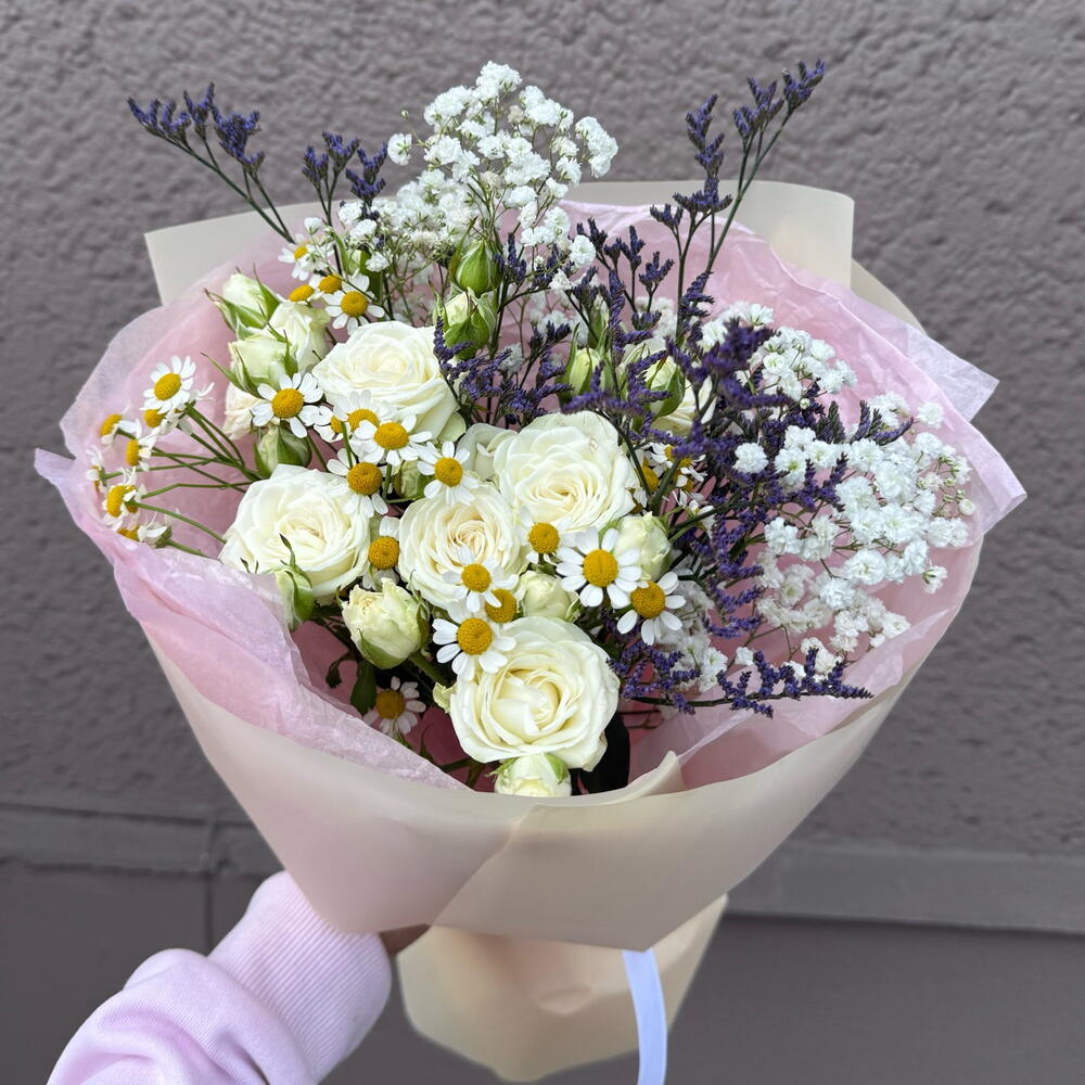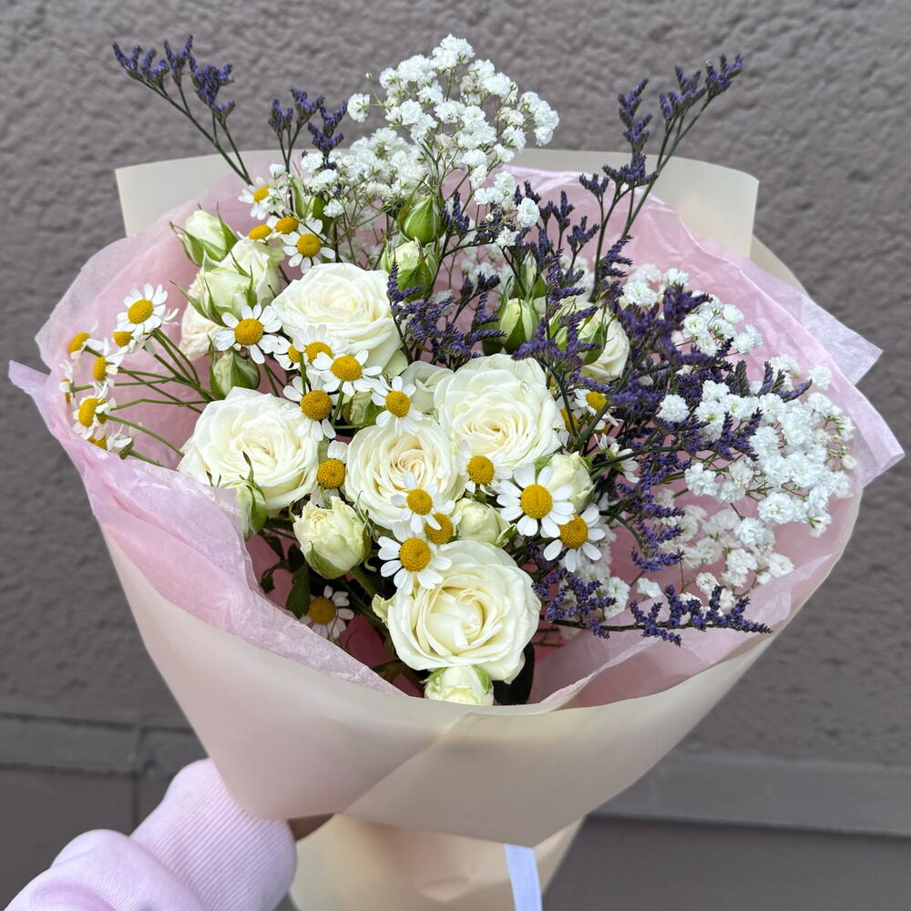 Limonio - 1 pz gipsofila - 1 pz rosa - 1 pz camomilla - 1 pz carta decorativa - 1 pz