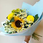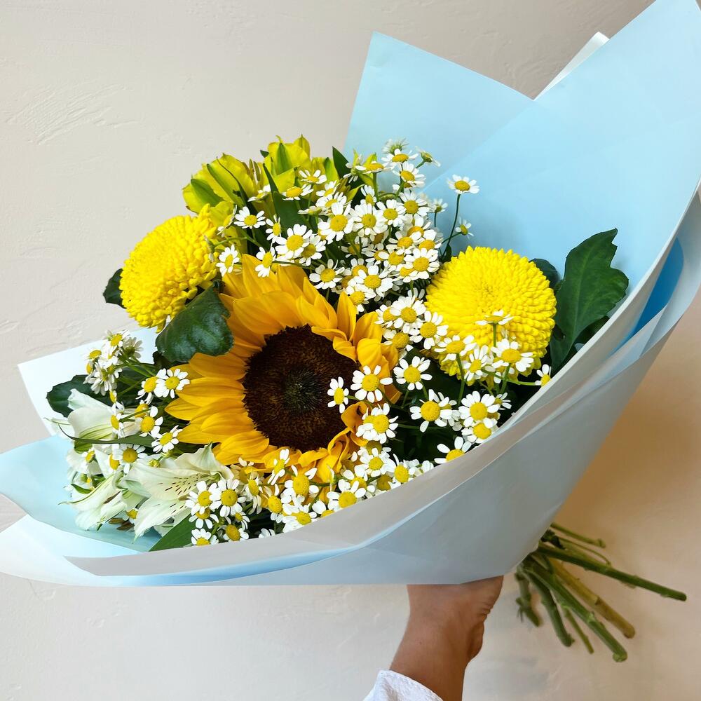 alstromerija - 2 pz crisantemo - 2 pz popierius - 1 pz ramune - 4 pz saulėgrąža - 1 pz