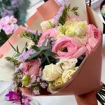 Aprašymas Puokštę sudaro ranunklai, eustoma, smulkus eukaliptas bei violetinis limoniumas. Floristas pasilieka teisę keisti puokštės sudėtį priklausomai nuo turimo asortimento. Puokštė nuotraukoje yra M dydžio. Įpakavimas įskaičiuotas į puokštės kainą. Galimi puokštės dydžiai- M- 5 vedrynai, 1 limoniumas, 3 eustomos, žaluma.