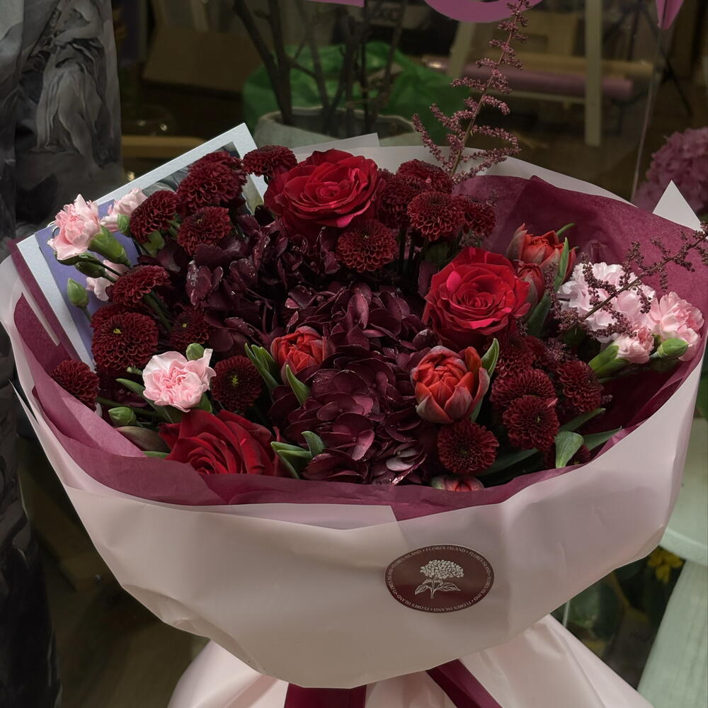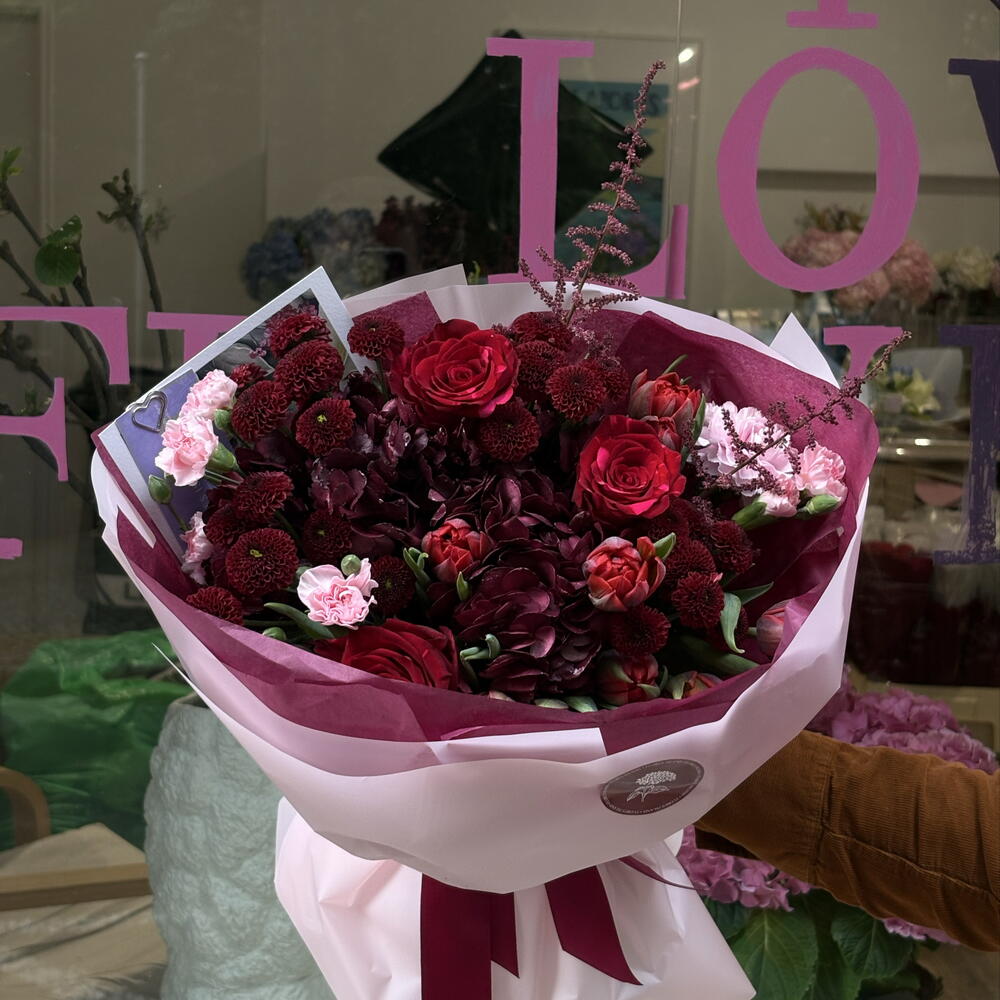 Ortensia - 2 pz Tulipano - 4 pz Cespuglio di crisantemo - 3 pz Rosa - 3 pz Garofano - 3 pz