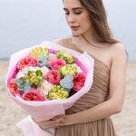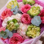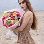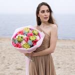 Букет красивый получился. Доставили немного позже назначенного времени, не критично для нас это было. Фото отчет сделали быстро. Доставка считаю дорогая, плюс большие розы не первой свежести были.