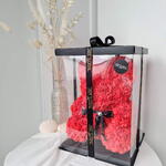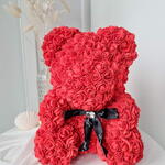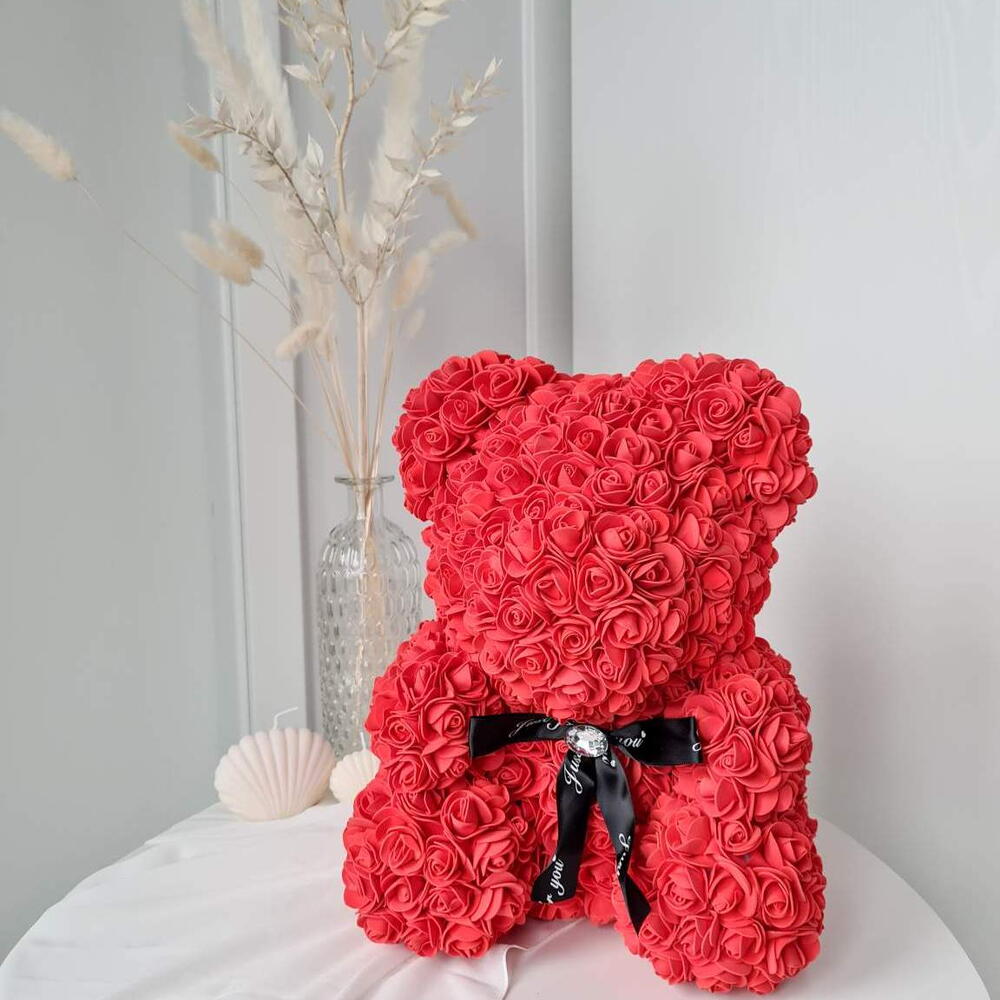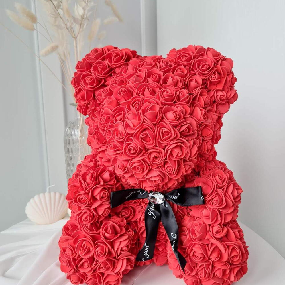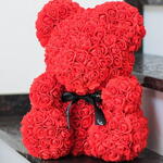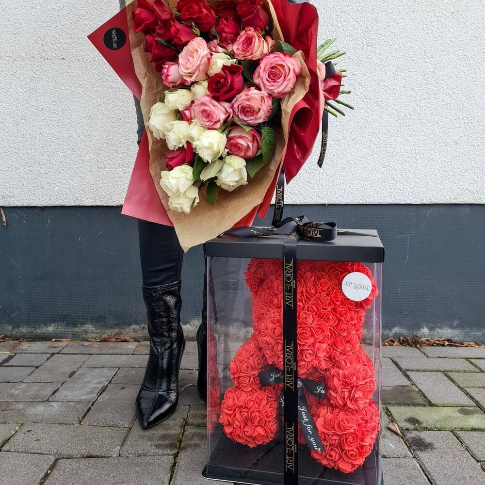 Der Rosenbär aus leuchtend roten PE-Schaumstoffrosen ist ein Symbol der leidenschaftlichen Liebe und des unerschütterlichen Engagements. Diese kräftige Farbe strahlt Feuer, Energie und die Tiefe der Gefühle aus. Die Bärchen wurden nach dem Klassischen Spielzeug „Teddy Bear“, das seit über 20 Jahren berühmt ist, erschaffen. Jeder Bär wird in Handarbeit aus mehr als 500 PE-Schaumstoff Rosen, die sehr angenehm anzufassen sind, erstellt. Ein Bärchen aus diesen Rosen hat es noch nicht geschafft zur Alltäglichkeit zu werden, deshalb wird Ihr Geschenk nicht nur das knuffigste, sondern auch das originellste und das markanteste. Bei Art Floral achten ganz besonders auf die Qualität. Dabei legen wir bei unseren Bären den Wert auf jede einzelne Blume. Die Form, die Dichte der Blumen, der feste Sitz jeder einzelner Blume sind drei wichtigste Kriterien. Ein Bärchen aus diesen Rosen hat es noch nicht geschafft zur Alltäglichkeit zu werden und ist deshalb ein Hingucker in jeder Alltäglichen Situation. Die Bärchen benötigen keine besondere Pflege, wir empfehlen keine direkte Sonneneinstrahlung, um das verblassen der Farben zu vermeiden. In diesem Fall wird der Bär über lange Jahre Freude bereiten. Zum Entstauben, den Bären einfach mit dem Fön abpusten. Sollte der unwahrscheinliche Fall eintreten, dass eine Blume abfällt, kann diese einfach mit einem Heißkleber wieder angeklebt werden.