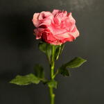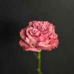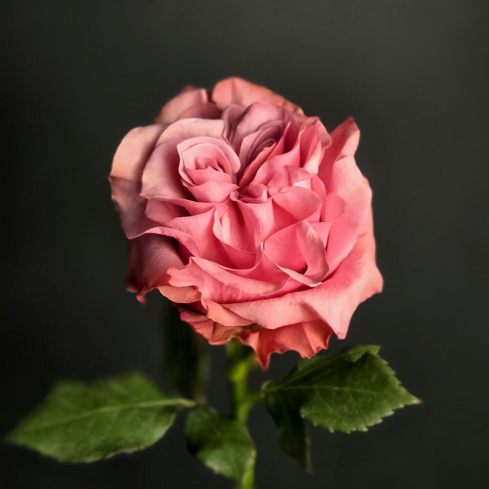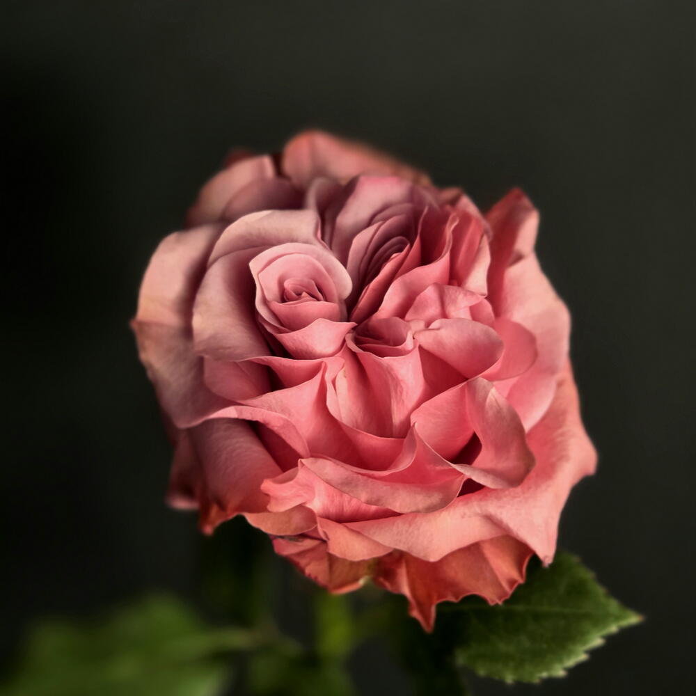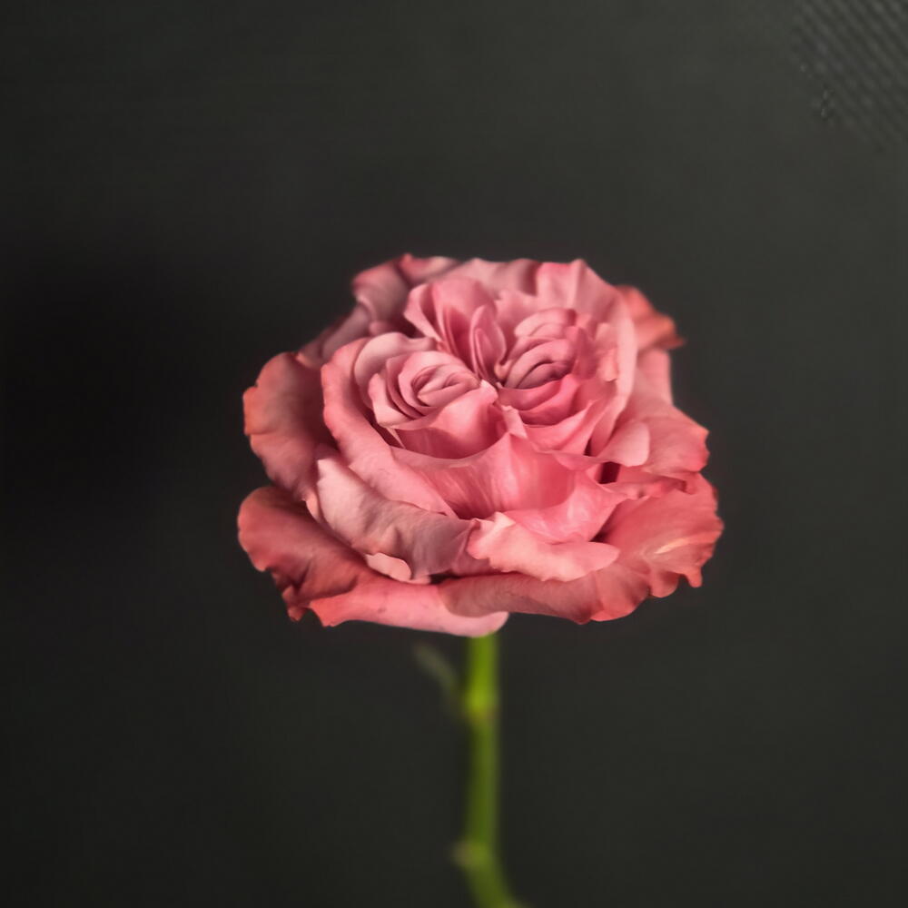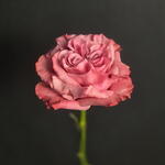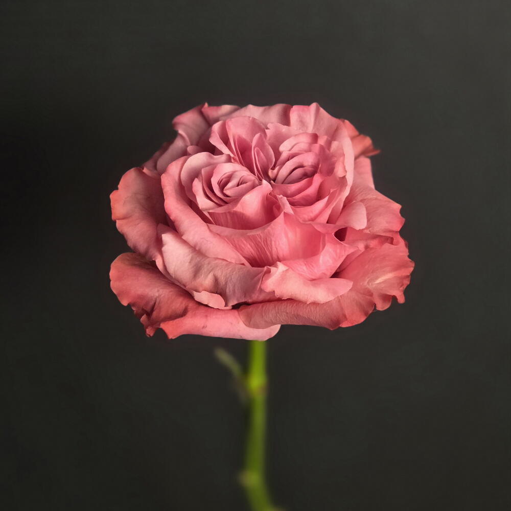 Una rosa ibrida tea dal fiore a peonia, nota per i suoi petali di un rosa polveroso, arricciati e disposti a forma di cuore, che creano un aspetto elegante e romantico.