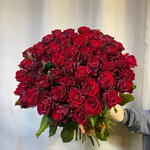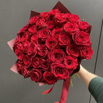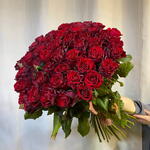Rosa Rossa Polacca - la rosa è lunga 50 cm. La testa della rosa è più piccola del solito. Attenzione! Nel caso in cui il cliente non risponda al telefono per concordare il bouquet, la sua composizione potrebbe essere modificata con i fiori disponibili in magazzino, ma lo stile e il colore rimarranno gli stessi.