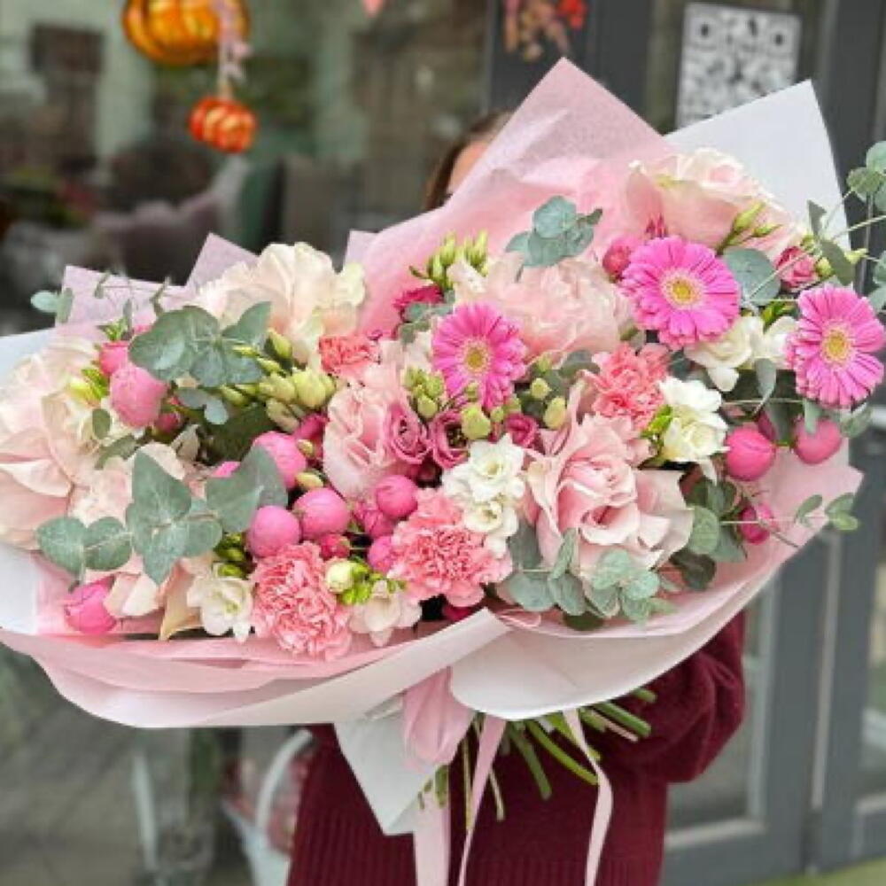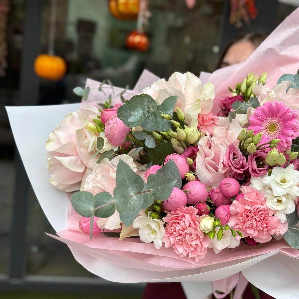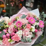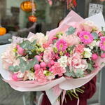 Gerbera - 5 pz Dianthus - 7 pz Freesia Bianca - 7 pz Роза спрей розовая - 5 pz Эвкалипт Микс - 5 pz французские розы - 7 pz упор - 5 pz