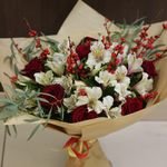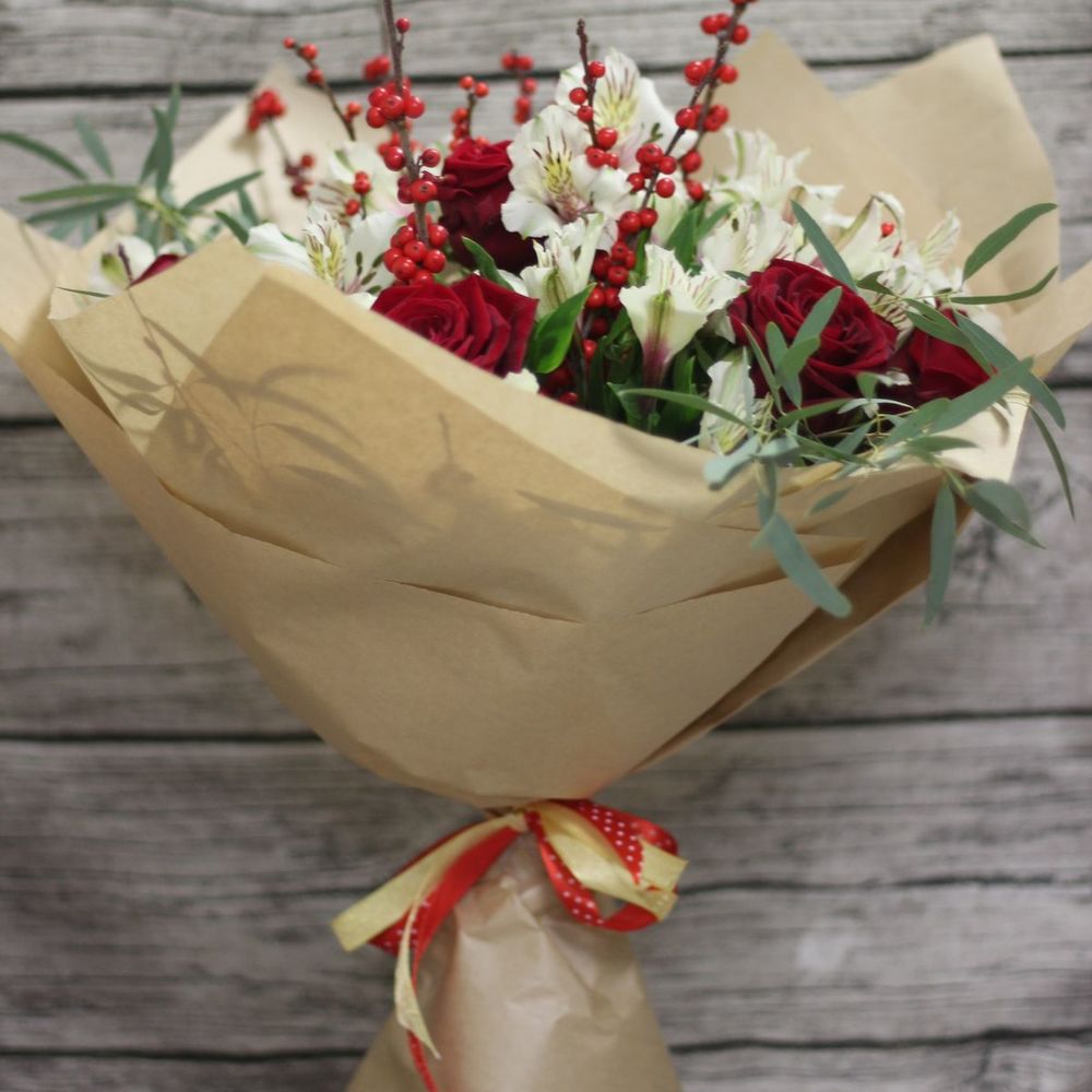 Alstroemeria - 7 pz Kraft - 1 pz rosa Red Naomi 50 cm Russia - 7 pz eucalyptus nicoli - 2 pz agrifoglio - 3 pz