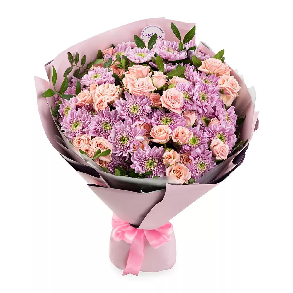 confezione decorativa - 1 pz crisantemo arbustivo - 7 pz rosa arbustiva - 7 pz verdure verdi - 3 pz