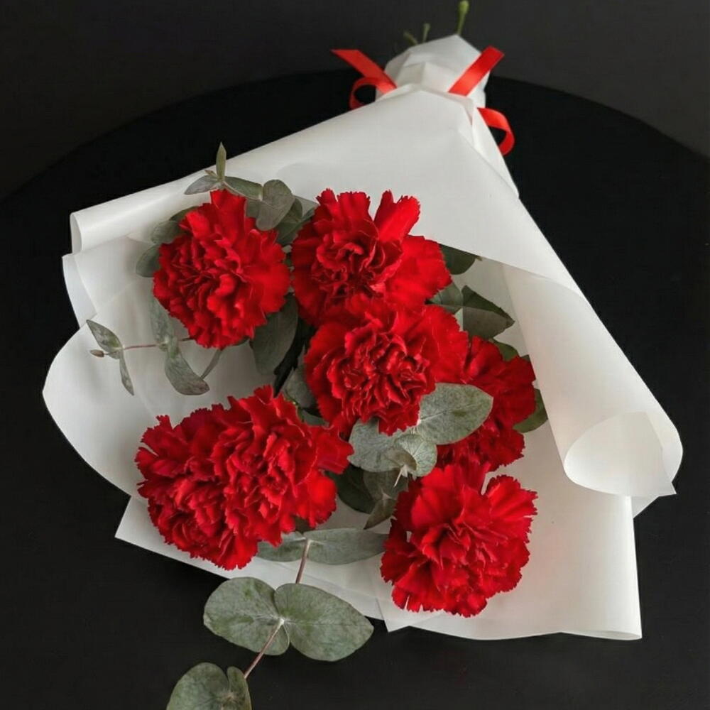 Semplice, elegante e incredibilmente raffinato. Questo bouquet presenta 7 garofani rossi premium (Dianthus) valorizzati dal profumato fogliame di eucalipto. Avvolto in carta bianca croccante, il contrasto crea un effetto visivo sorprendente. Minimalismo al suo meglio. Un elegante abbinamento di garofani rossi resistenti con foglie argentate di eucalipto. Questo bouquet è la prova che i garofani sono ora tra i fiori più alla moda nella floristica.